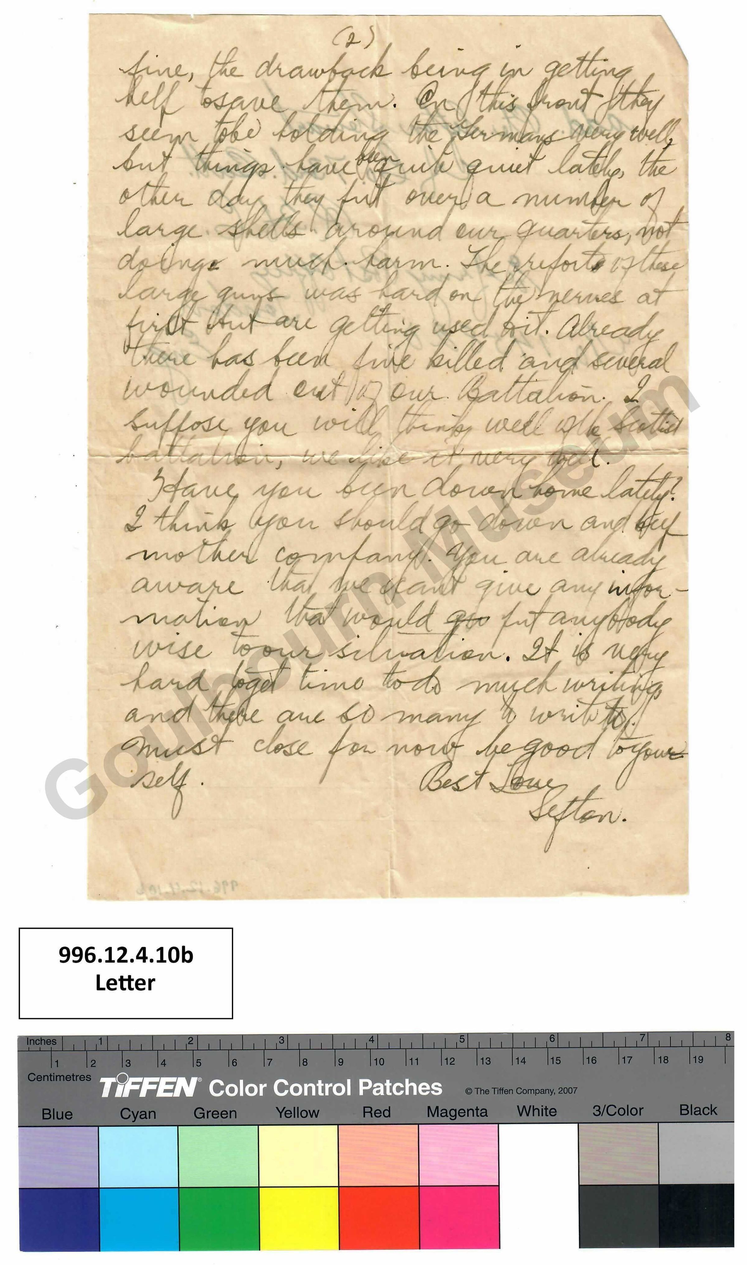 Have you been down home lately? I think you should go down and keep mother company. You are already aware that we can’t give any information that would [crossed out: giv] put anyone wise to our situation. It is very hard to get time to do much writing, and there are so many to write to. Must close for now be good to yourself.