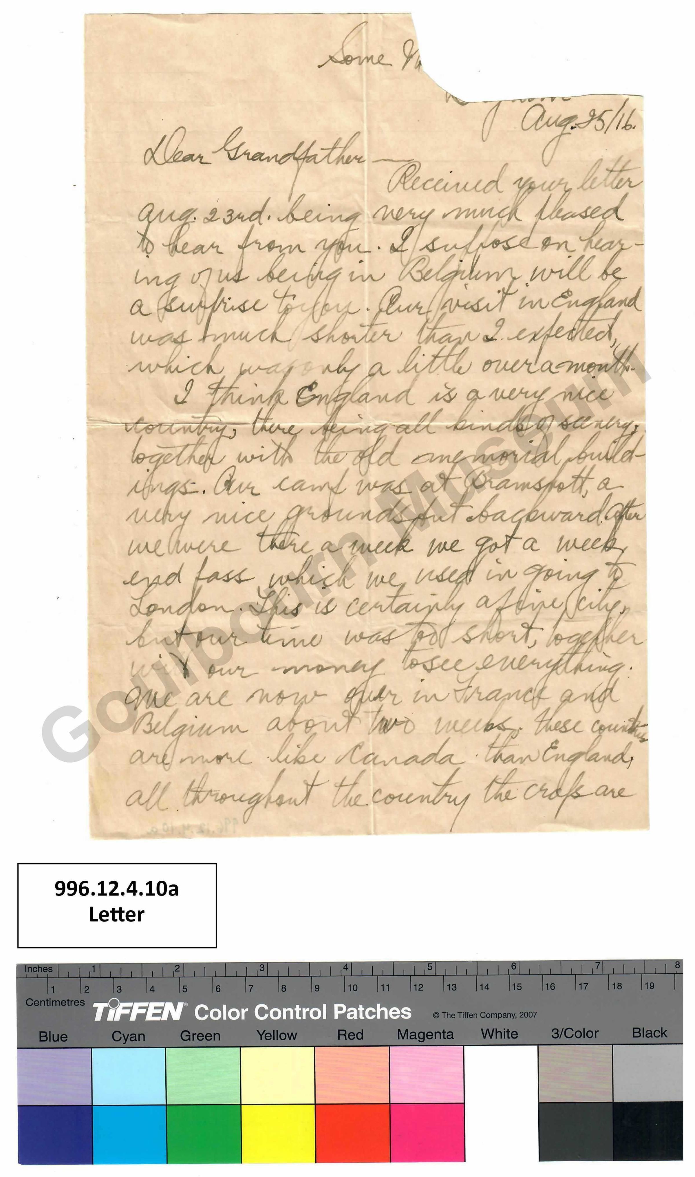 Letter written by Sefton Stewart to his grandfather. Letter is dated August 25, 1916 and was written while Stewart was serving in Belgium during WWI.Subject Person/Organization