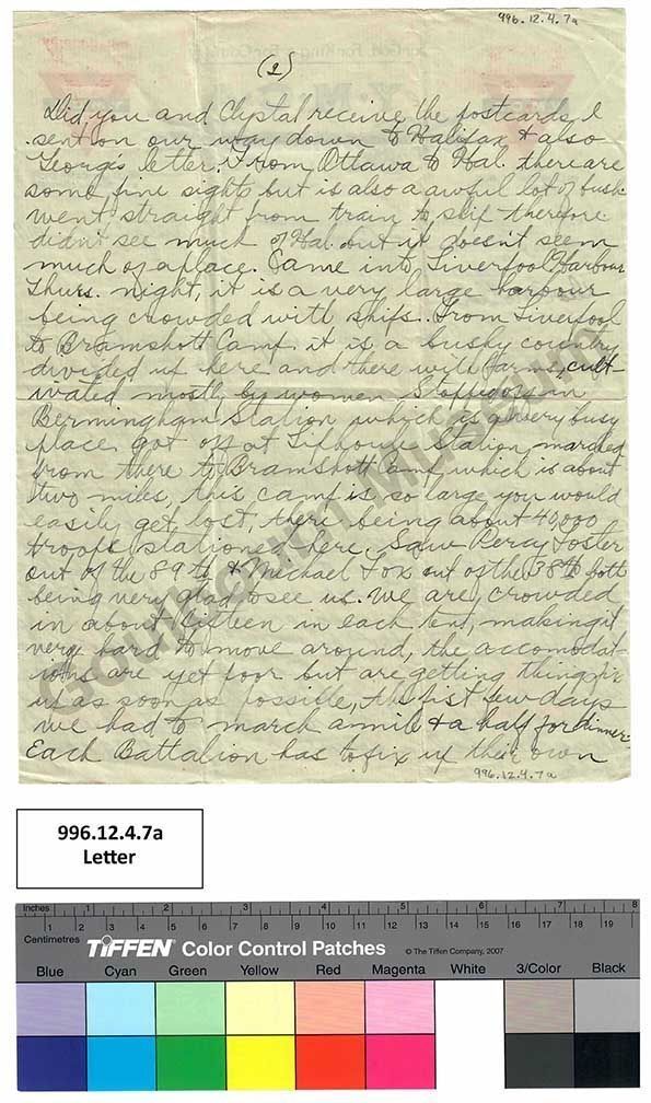 Did you and Clystal receive the postcards I sent on our way down to Halifax + also George’s letter. From Ottawa to Hal. there are some fine sights but is also a awful lot of bush. Went straight from train to ship therefore didn’t see much of Hal. but it doesn’t seem much of a place. Came into Liverpool Harbour Thurs. night, it is a very large harbour being crowded with ships. From Liverpool to Bramshott Camp it is a bushy country divided up here and there with farms cultivated mostly by women. Stopped off in Bermingham [spelling error: Birmingham] Station which is a very busy place. got off at Liphoule Station marched from there to Bramshott Camp which is about two miles, this camp is so large you would easily get lost, there being about 40,000 troops stationed here. Saw Percy Foster out of the 89th + Michael Fox out of the 38th both being very glad to see us. We are crowded in about fifteen in each tent, making it very hard to move around, the accomodations [spelling error: accommodations] are yet poor but are getting things fix up as soon as possible, the first few days we had to march a mile + a half for dinner. Each Battalion has to fix up their own