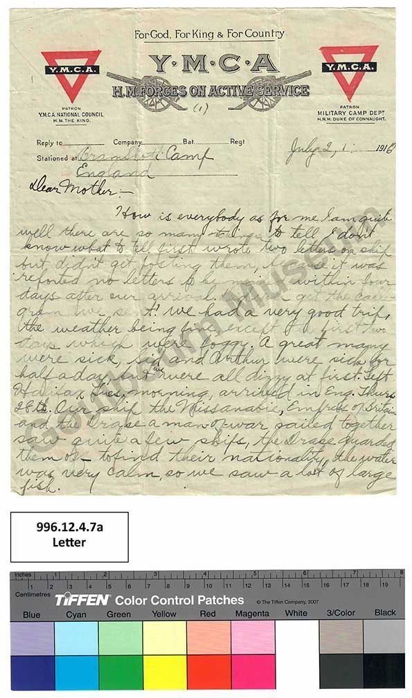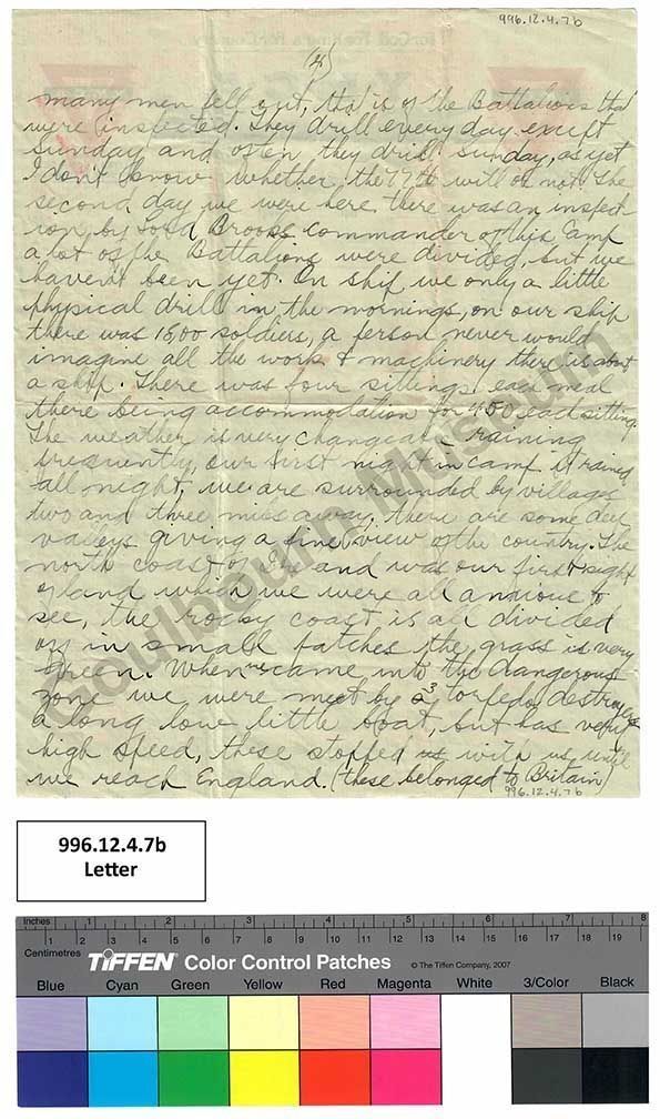 many men fell out, that is of the Battalions that were inspected. They drill every day except Sunday and often they drill Sunday, as yet I don’t know whether the 77th will or not. The second day we were here there was an inspection by Lord Brooks Commander of this Camp a lot of the Battalions were divided, but we haven’t been yet. On ship we only a little physical drill in the mornings, on our ship there was 18,000 soldiers, a person never would imagine all the work + machinery there is about a ship. There was four sittings each meal there being accommodations for 4500 each sitting. The weather is very changeable raining frequently, our first night in camp it rained all night, we are surrounded by villages two and three miles away, there are some deep valleys giving a fine view of the country. The north coast of Ireland was our first sight of land which we were all anxious to see, the rocky coast is all divided off in small patches the grass is very green. When we came into the dangerous zone we were met by [crossed out: a] 3 torpedo destroyers a long low little boat, but has very high speed, these stopped [crossed out: us] with us until we reach England. (these belonged to Britain)