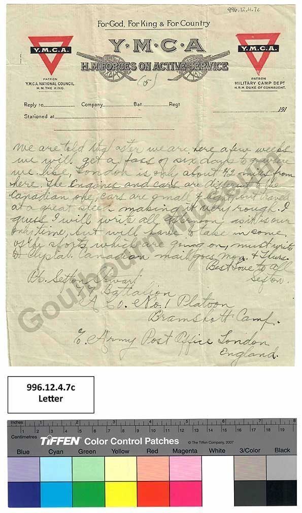 How is everybody as for me I am quite well there are so many things to tell I don’t know what to tell first wrote two letters on ship but didn’t get posting them, because it was reported no letters to be mailed within four days after our arrival. Did you get the cable gram we sent? We had a very good trip, the weather being fine, except the first two days which were foggy. A great many were sick, Sid and Arthur were sick for half a day, but we were all dizzy at first. Left Halifax Tues. morning, arrived in Eng. Thurs 28th. Our ship, the Missanabie, Empress of Britain and the Drake a man-of-war sailed together saw quite a few ships, the Drake guarded them off to find their nationality, the water was very calm, so we saw a lot of large fish.