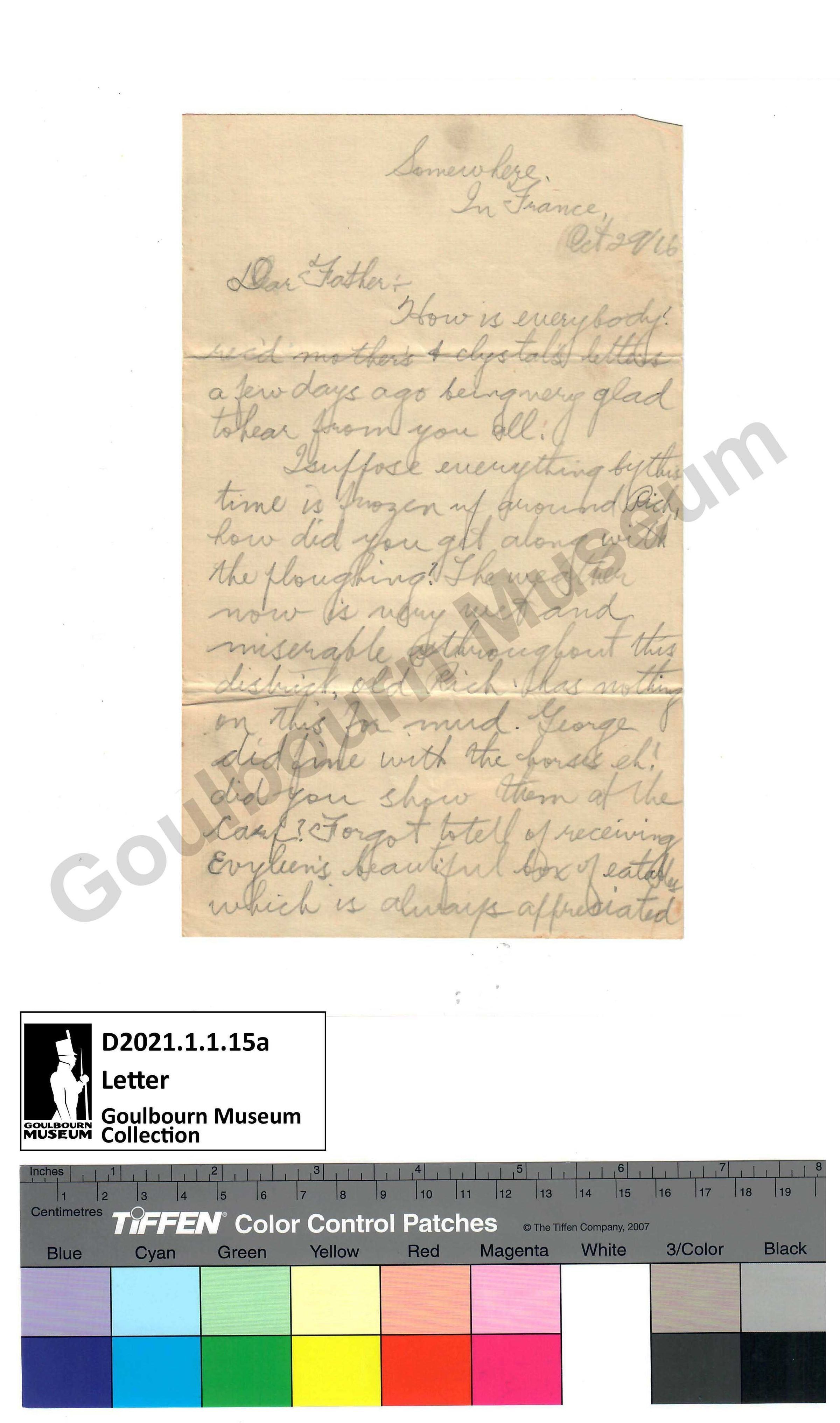Letter composed of 4 pages, not in envelope, written on paper with pencil. One page torn in half by censor. The letter was written by Richmond, ON resident Pte. Sefton Stewart while serving in the 73rd Battalion Canadian Infantry Royal Highlanders in France during the First World War. To Dear Father, dated Somewhere in France, Oct 29/16.Subject Person/Organization