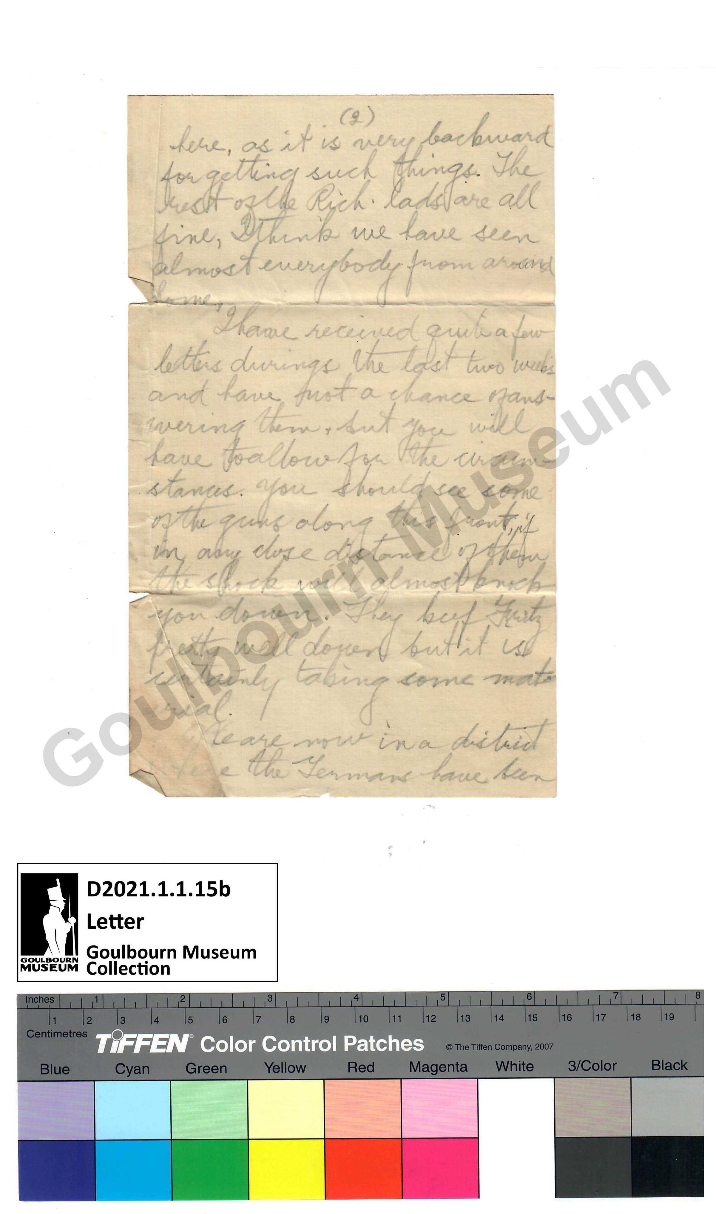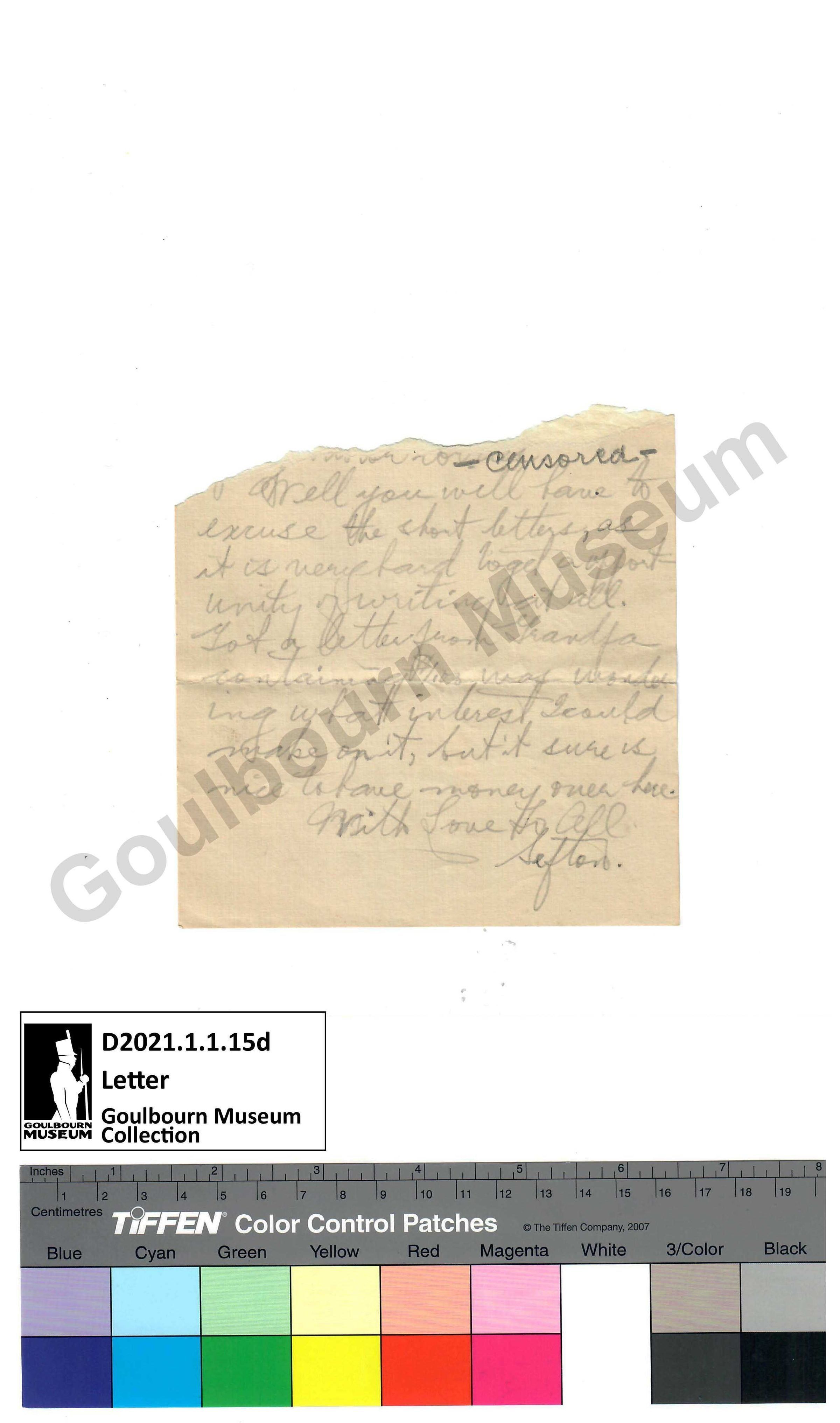Letter from the First World War collection of written letters by Sefton Stewart, a Richmond, Ontario resident who served with the Canadian Expeditionary Force during the Great War.Collection