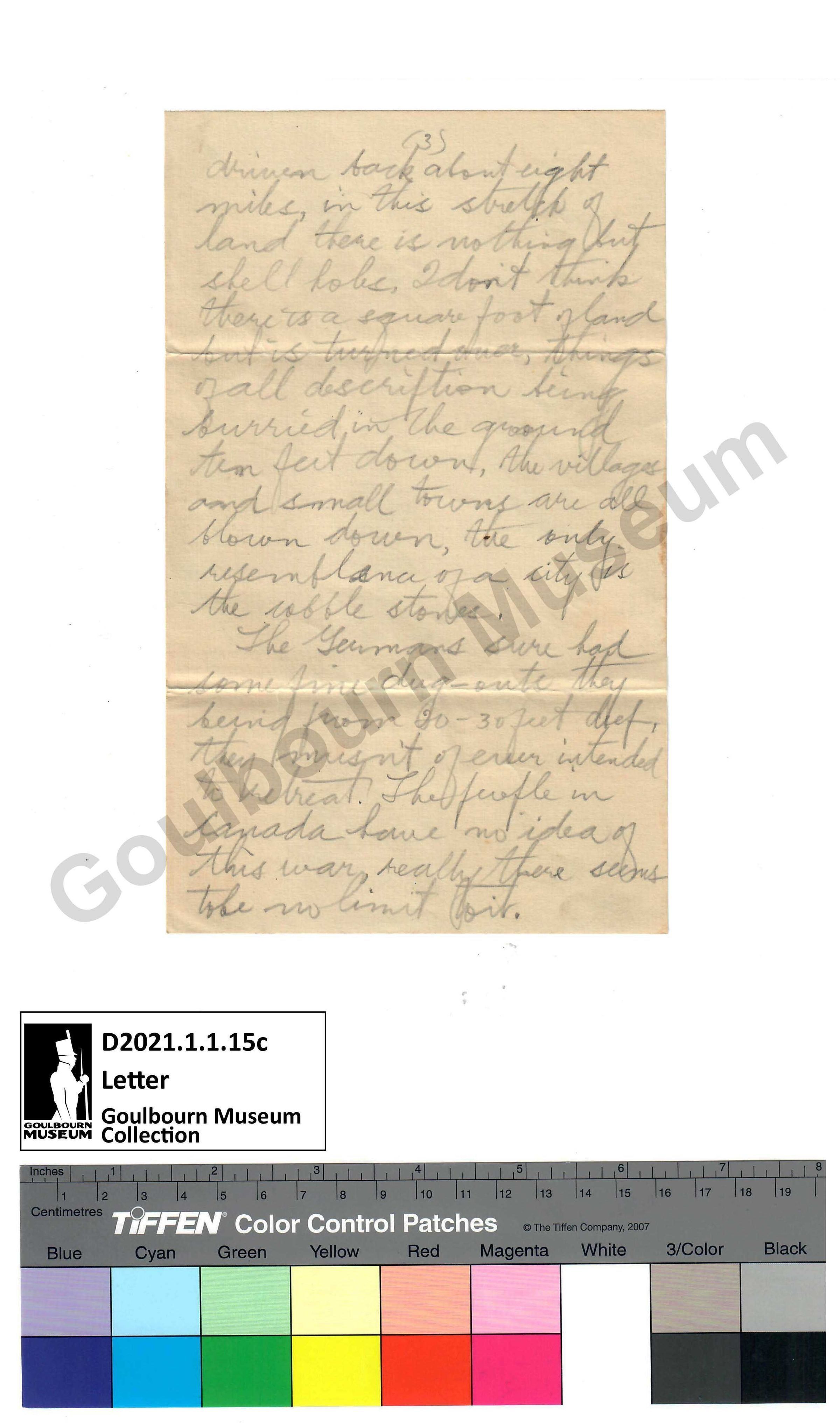 driven back about eight miles, in this stretch of land there is nothing but shell holes, I don't think there is a square foot of land but is turned over, things of all description being buried in the ground ten feet down, the villages and small towns are all blown down, the only resemblance of a city is the cobble stones.