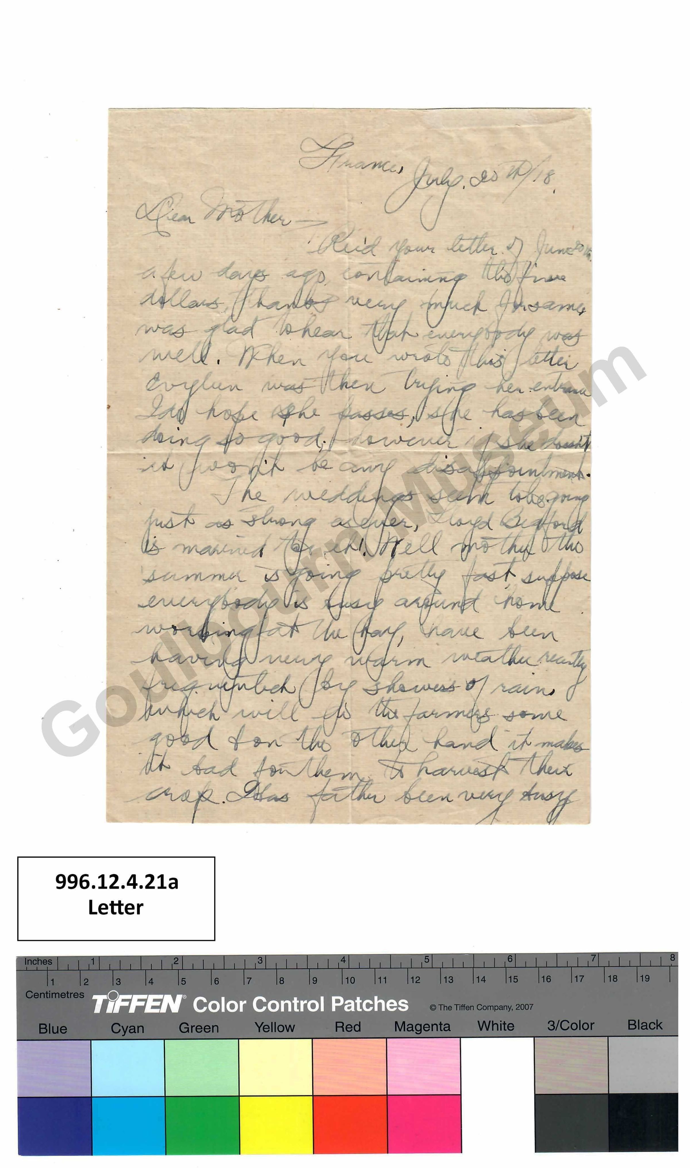 France, July 20th/18 Dear Mother, Rec'd [abbreviated: received] your letter of June 20th a few days ago containing the five dollars, thanks very much for same was glad to hear that everybody was well. When you wrote this letter Evylen was then trying her entrance. I do hope she passes, she has been doing so good. however if she doesn't it won't be any disappointment. The weddings seem to be going just as strong as ever, Lloyd Beaford is married now eh! Well mother this summer is going pretty fast suppose everybody is busy around home working at the hay, have been having very warm weather recently fragmented by showers of rain which will do the farms some good + on the other hand it makes it bad for them to harvest their crop. Idas father been very busy in the undertaking business? am sure you people must miss George that last snap you sent was very good of him, looked almost as I am, if is good he likes the work, + by this time he will be pretty well acquainted with the people. I also had word from Clystal in the same mail as yours came. Sefton.Transcriber
