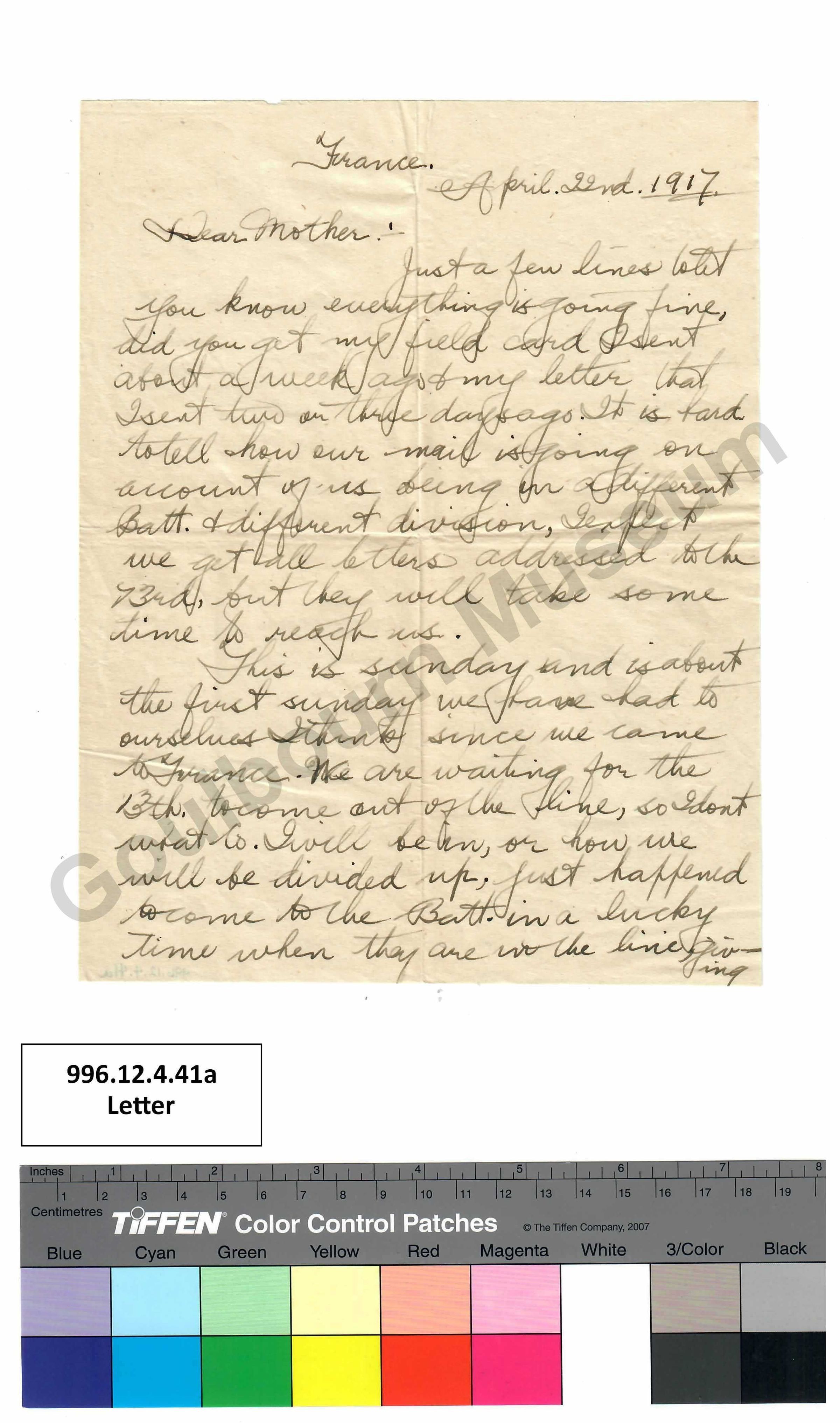 Letter: Sefton Stewart to Mother, April 22, 1917Entry/Object ID