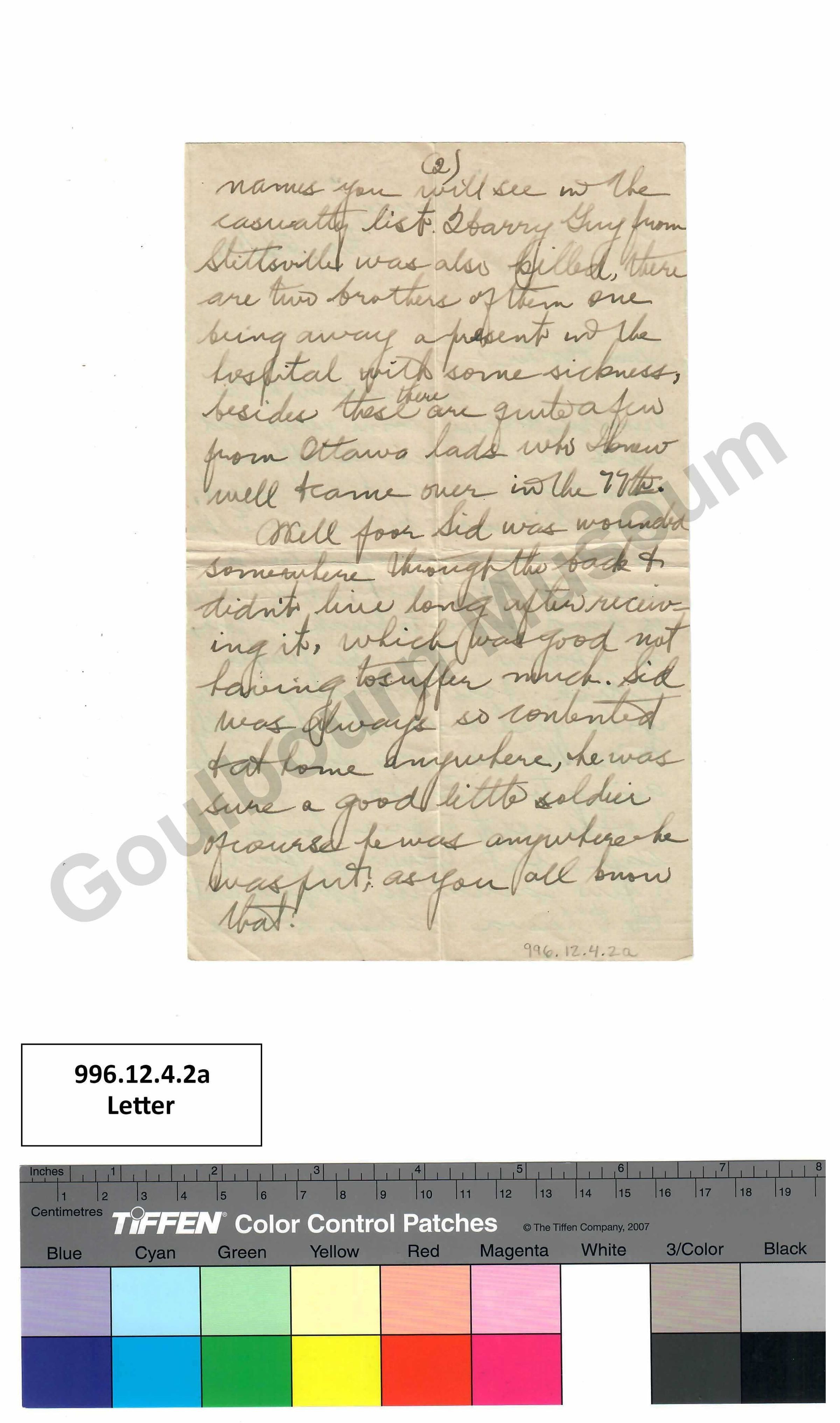 names you will see in the casualty list. Harry Guy from Stittsville was also killed, there are two brothers of them one being away a present in the hospital with some sickness, besides these there are quite a few from Ottawa lads who I knew well + came over in the 77th.