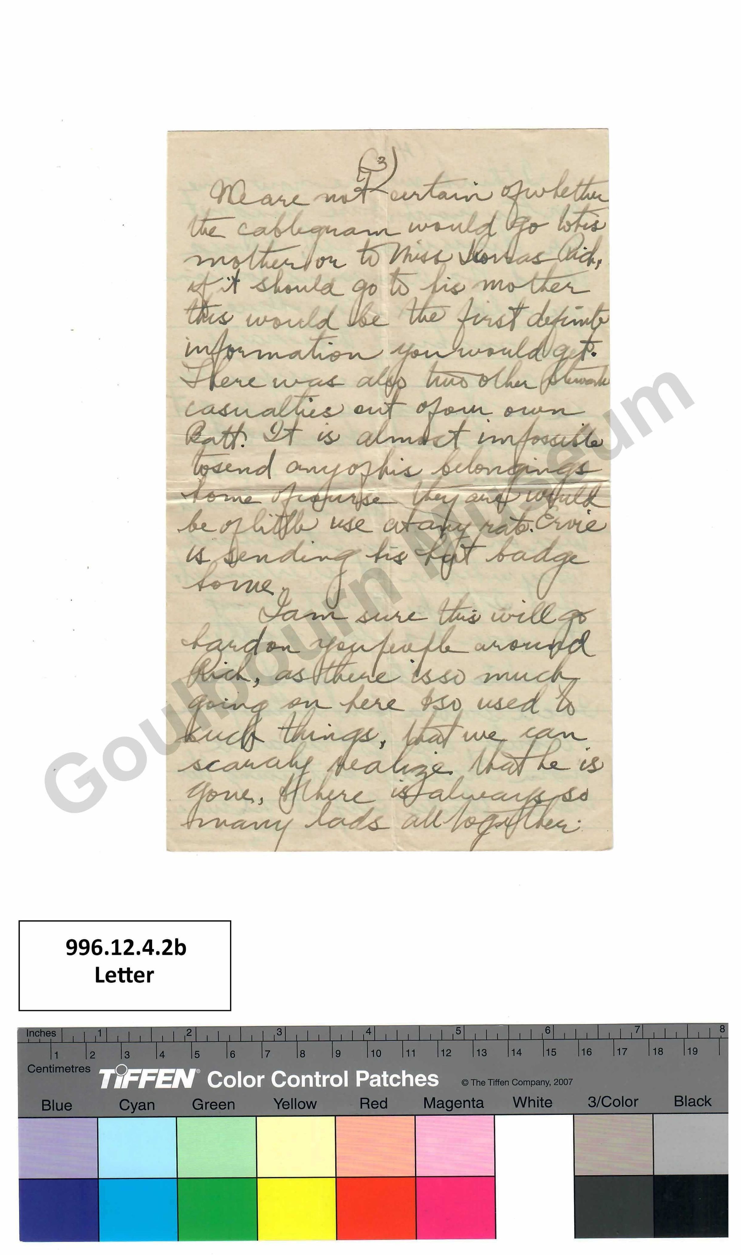 We are not certain of whether the cablegram would go to his mother or to Miss Dorras Rich, if it should go to his mother this would be the first definite information you would get. There was also two other Stewart casualties out of our own Batt. [abbreviated: Battalion] It is almost impossible to send any of his belongings home of course they are would be of little use at any rate. Ervie is sending his hat badge to home.