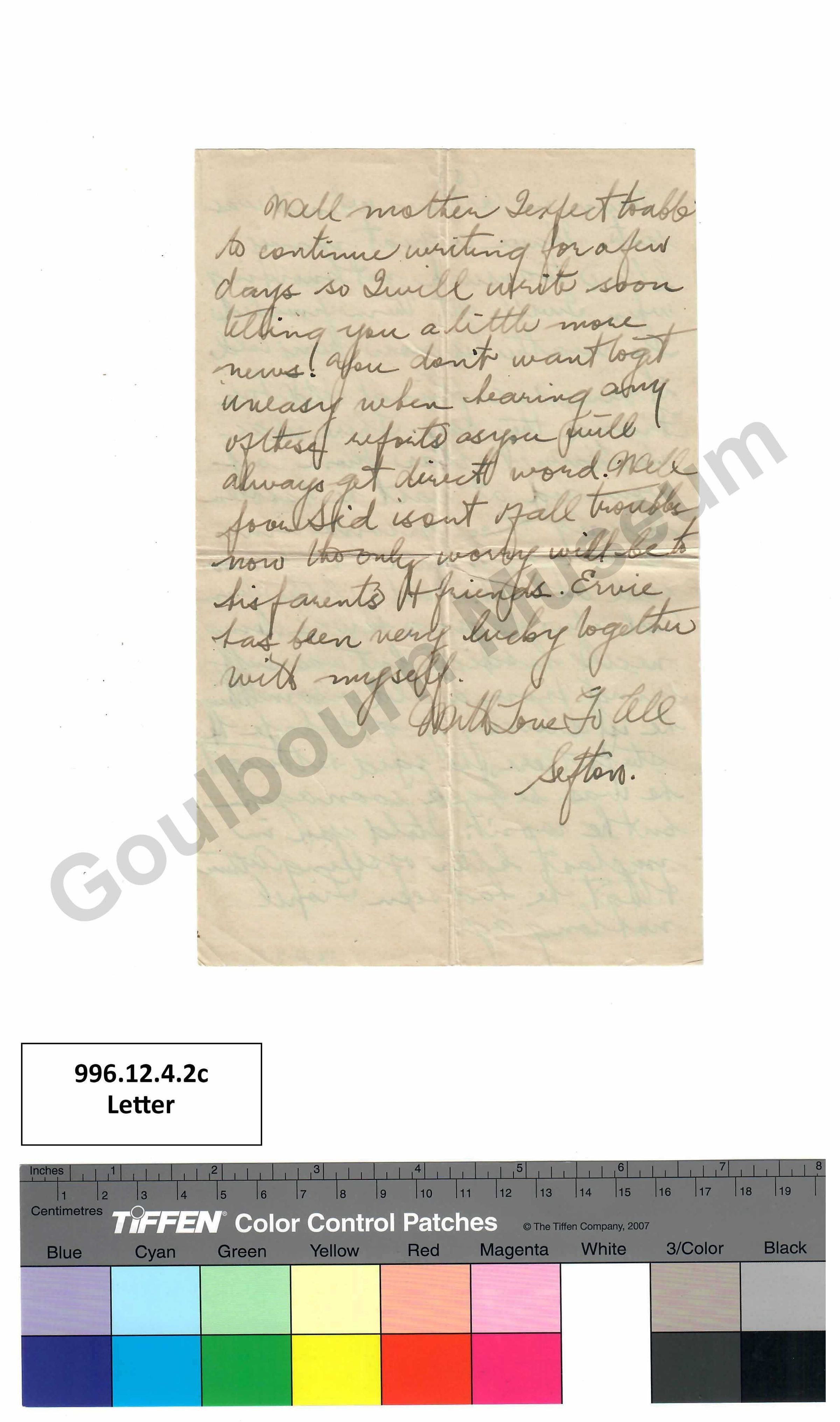 Well Mother I expect to able to continue writing for a few days so I will write soon telling you a little more news. You don’t want to get uneasy when hearing any of these reports as you will always get direct word. Well poor Sid is out of all troubles now the only worry will be to his parents and friends. Ervie has been very lucky together with myself