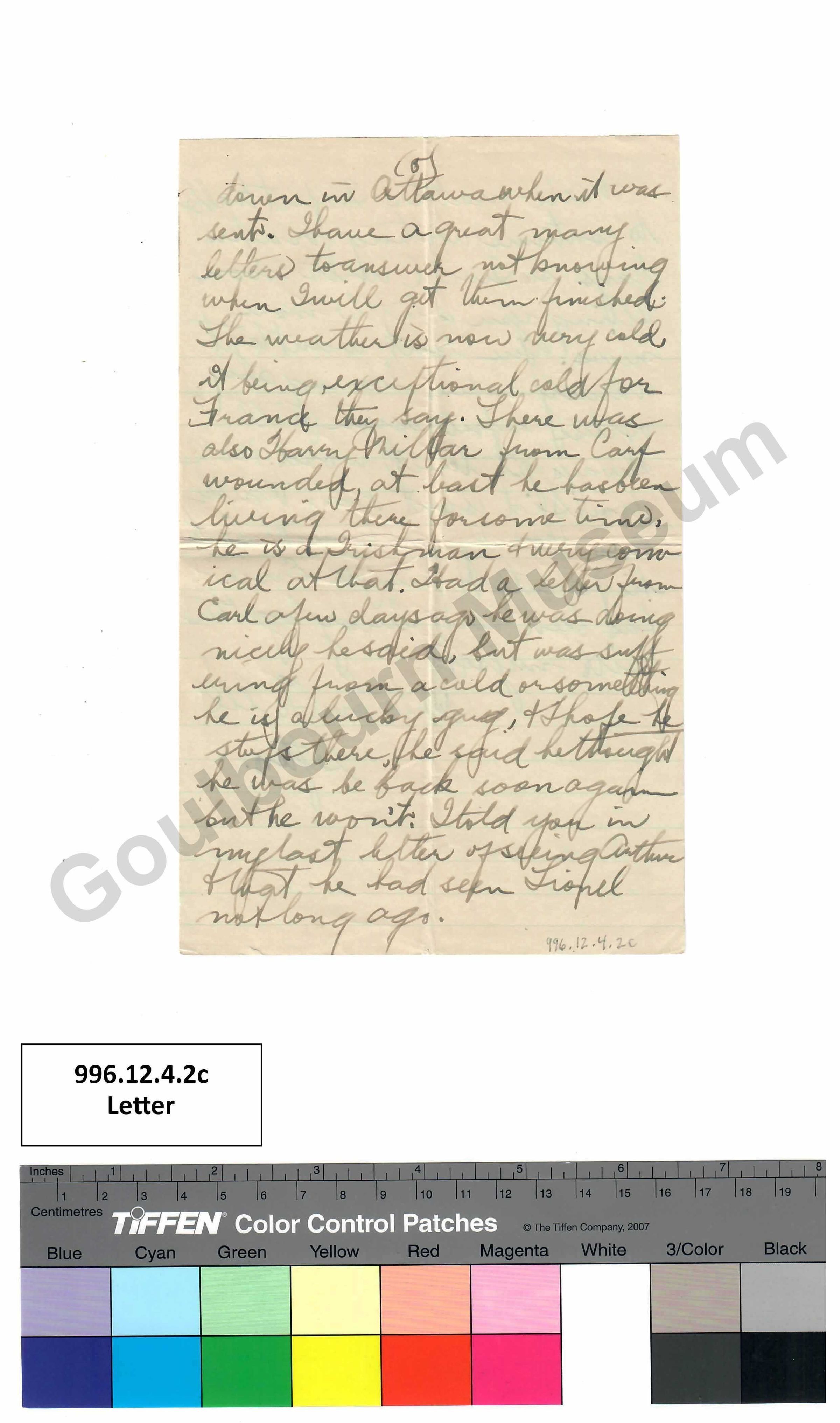 down in Ottawa when it was sent. I have a great many letters to answer not knowing when I will get them finished. The weather is now very cold, it being exceptional cold for France they say. There was also Harry Millar from Carp wounded, at least he has been living there for some time, he is a Irishman and very comical at that. Had a letter from Carl a few days ago he was doing nicely he said, but was suffering from a cold or something he is a lucky guy, + I hope he stays there, he said he thought he was be back soon again but he won’t. I told you in my last letter of seeing Arthur + that he had seen Lionel not long ago.