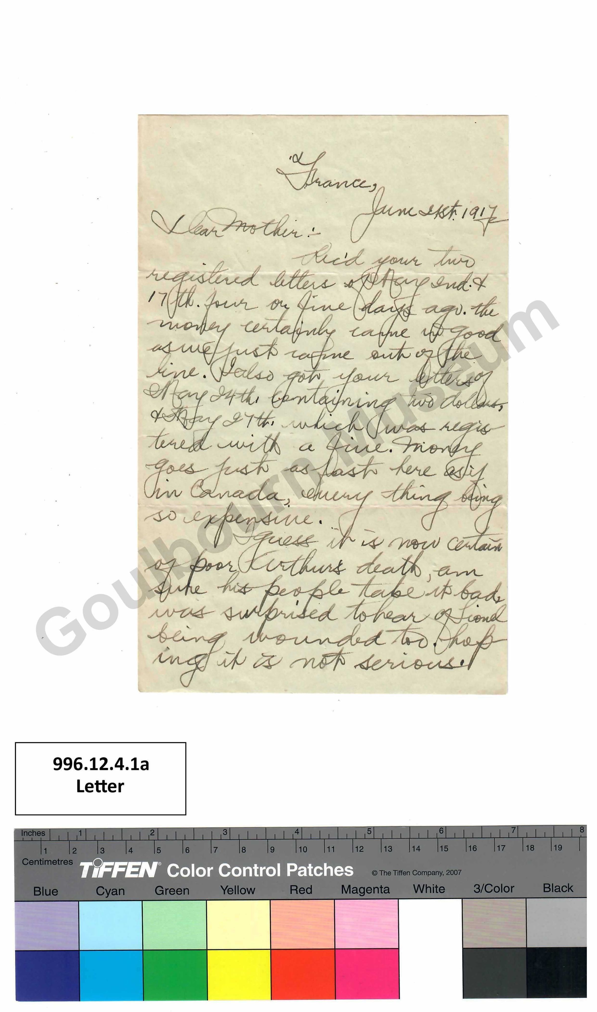 One three page letter, written on a plain sheet of paper with a cursive handwritten message preserved in black coloured ink. The letter was sent from France, dated June 21, 1917. The letter was written by Richmond, ON resident Pte. Sefton Stewart of the 77th Battalion, Canadian Expeditionary Force who served during the First World War. The letter is addressed to Seftons Mother, Mrs. James Stewart of Richmond, ON.Subject Person/Organization