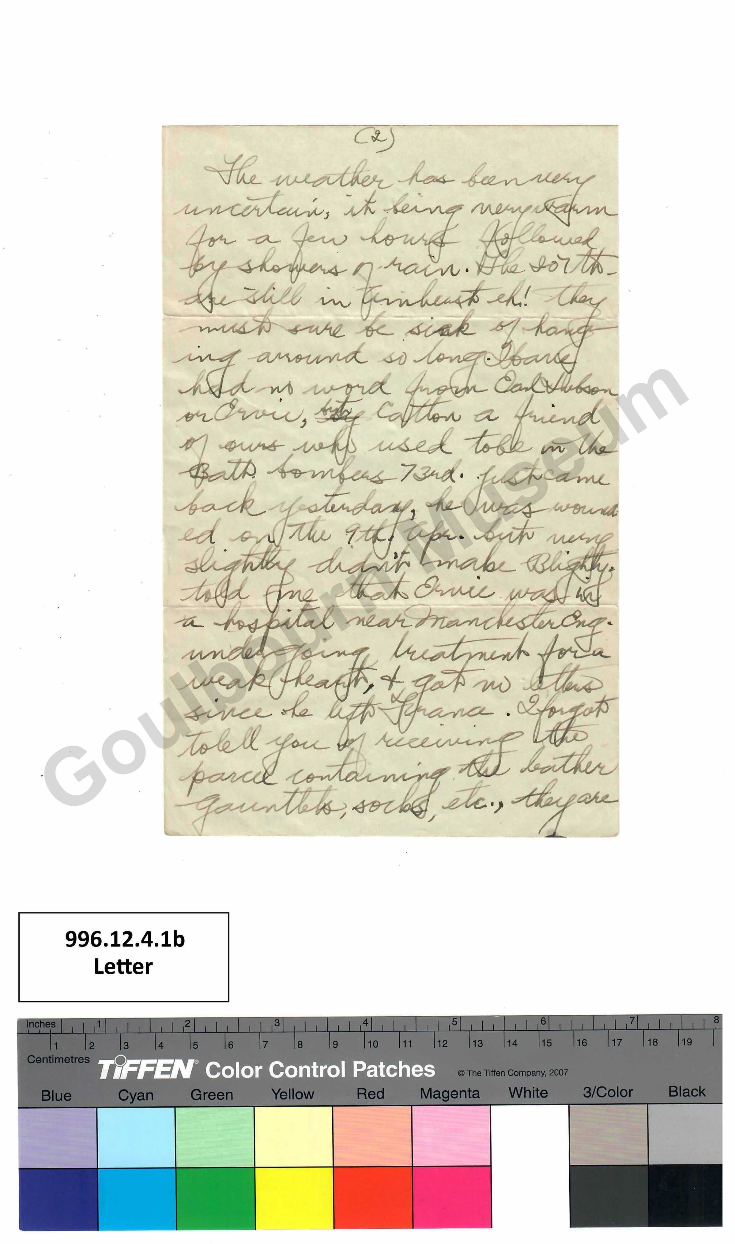 The weather has been very uncertain, it being very warm for a few hours followed by showers of rain. The 207th. are still in Amherst eh! They must sure be sick of hanging around so long. I have had no word from Earl Hobson or Ervie, [crossed out: oy] but Catton a friend of ours who used to be in the Bath bombers 73rd. just came back yesterday, he was wounded on the 9th. Apr. but very slightly didn’t make Blighty. told me that Ervie was in a hospital near Manchester Eng. undergoing treatment for a weak heart, + got no letters since he left France. I forgot to tell you of receiving the parcel containing the leather gauntlets, socks, etc., they are