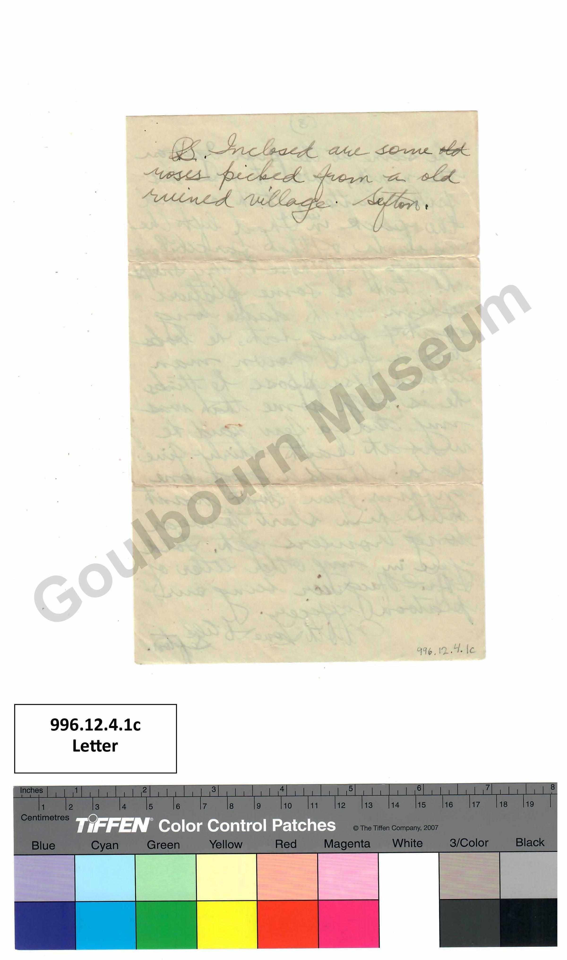 PS. Inclosed [Spelling error: Enclosed] are some [crossed out: old] roses picked from a old ruined village. Sefton."Language