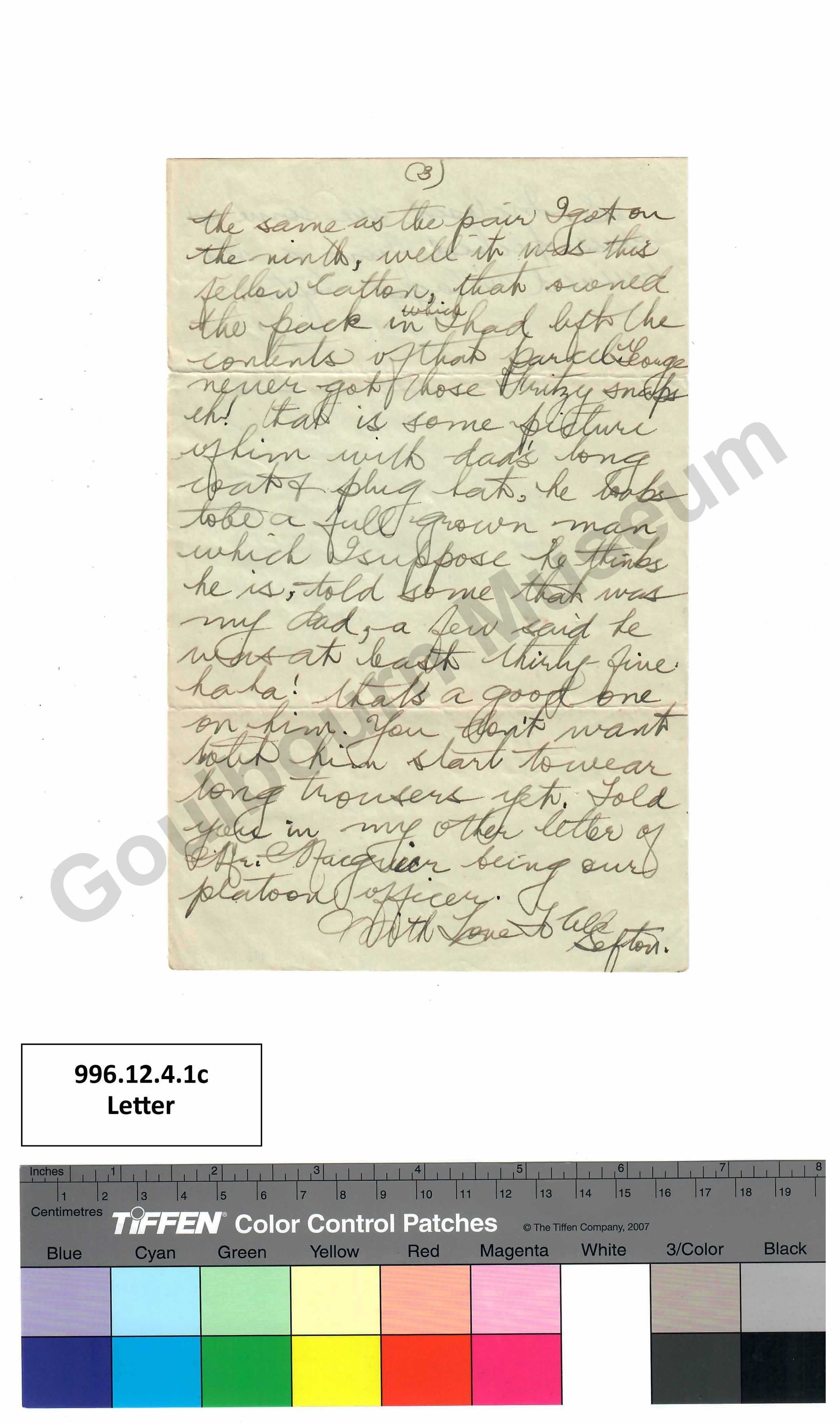 the same as the pair I got on the ninth, well it was this fellow Catton, that owned the pack in which I had left the contents of that parcel. George never got those Fritzy snaps eh! tat [spelling error: that] is some picture of him with dad’s long coat + plug hat, he looks to be a full grown man which I suppose he thinks he is, told some that was my dad, a few said he was at least thirty-five ha ha! that’s a good one on him. You don’t want to let him to start to wear long trousers yet. Told you in my other letter of [indistinguishable] Macguier being our platoon officer.