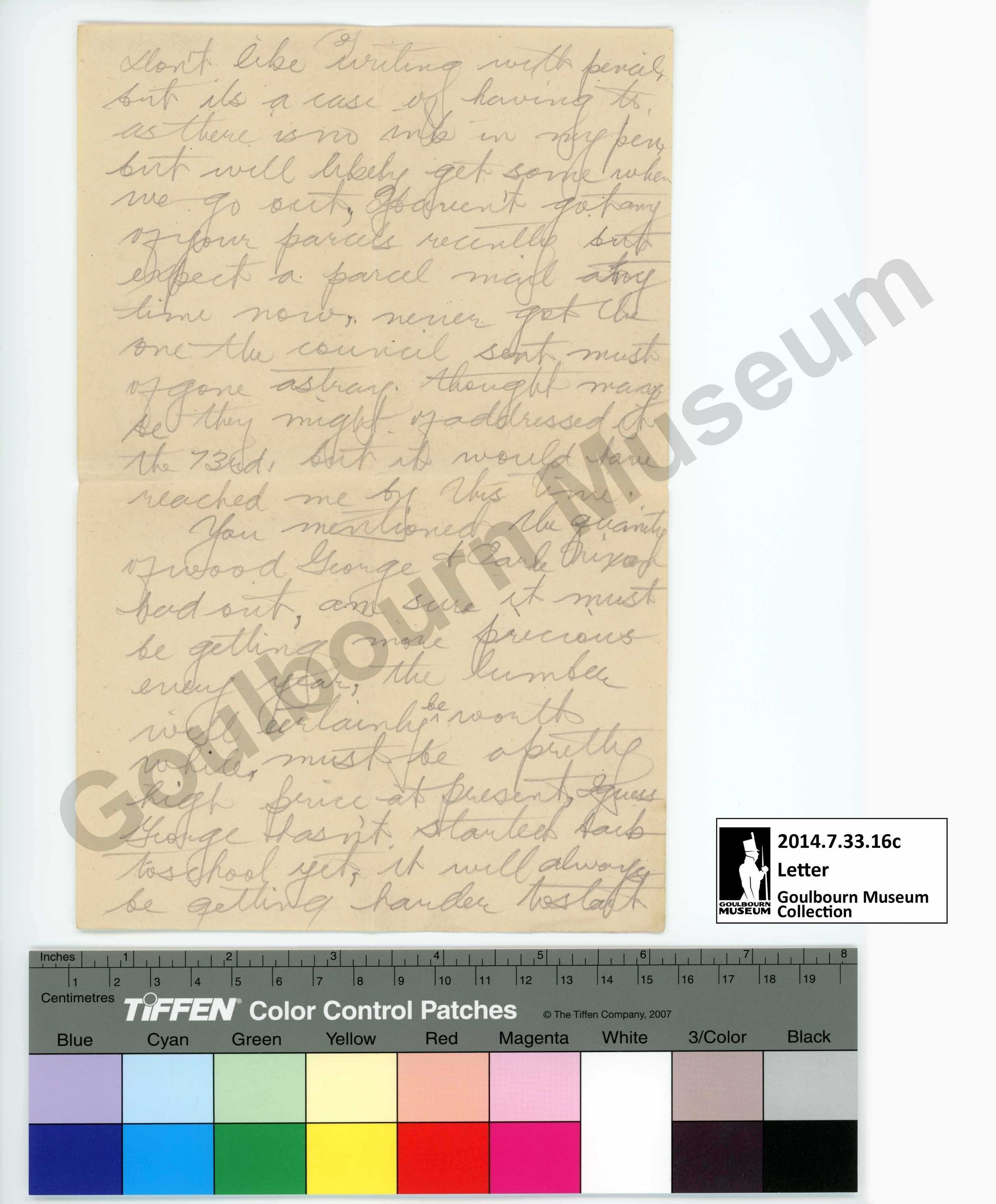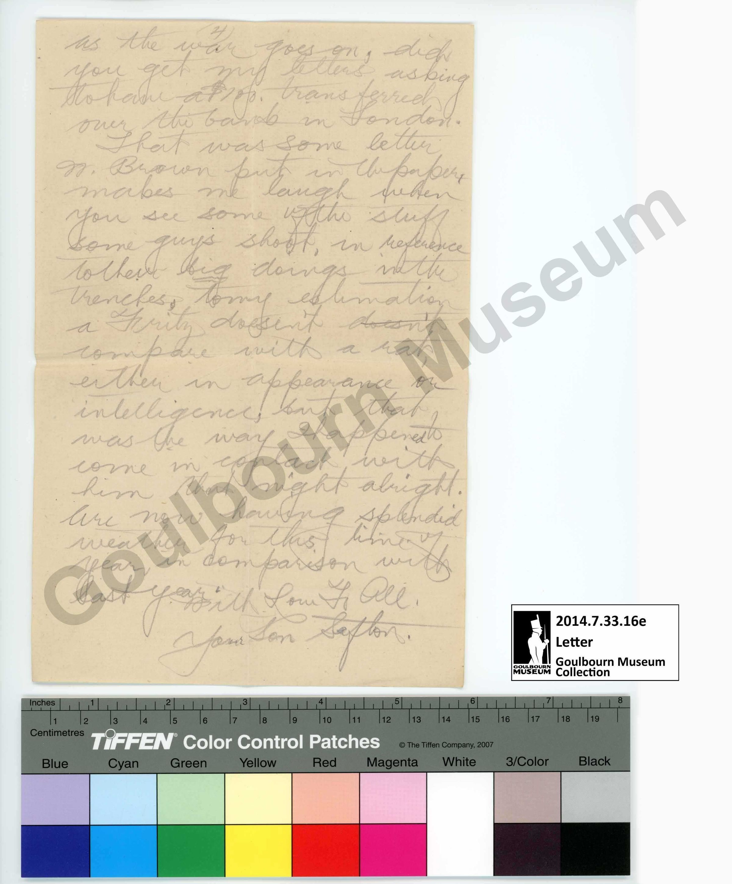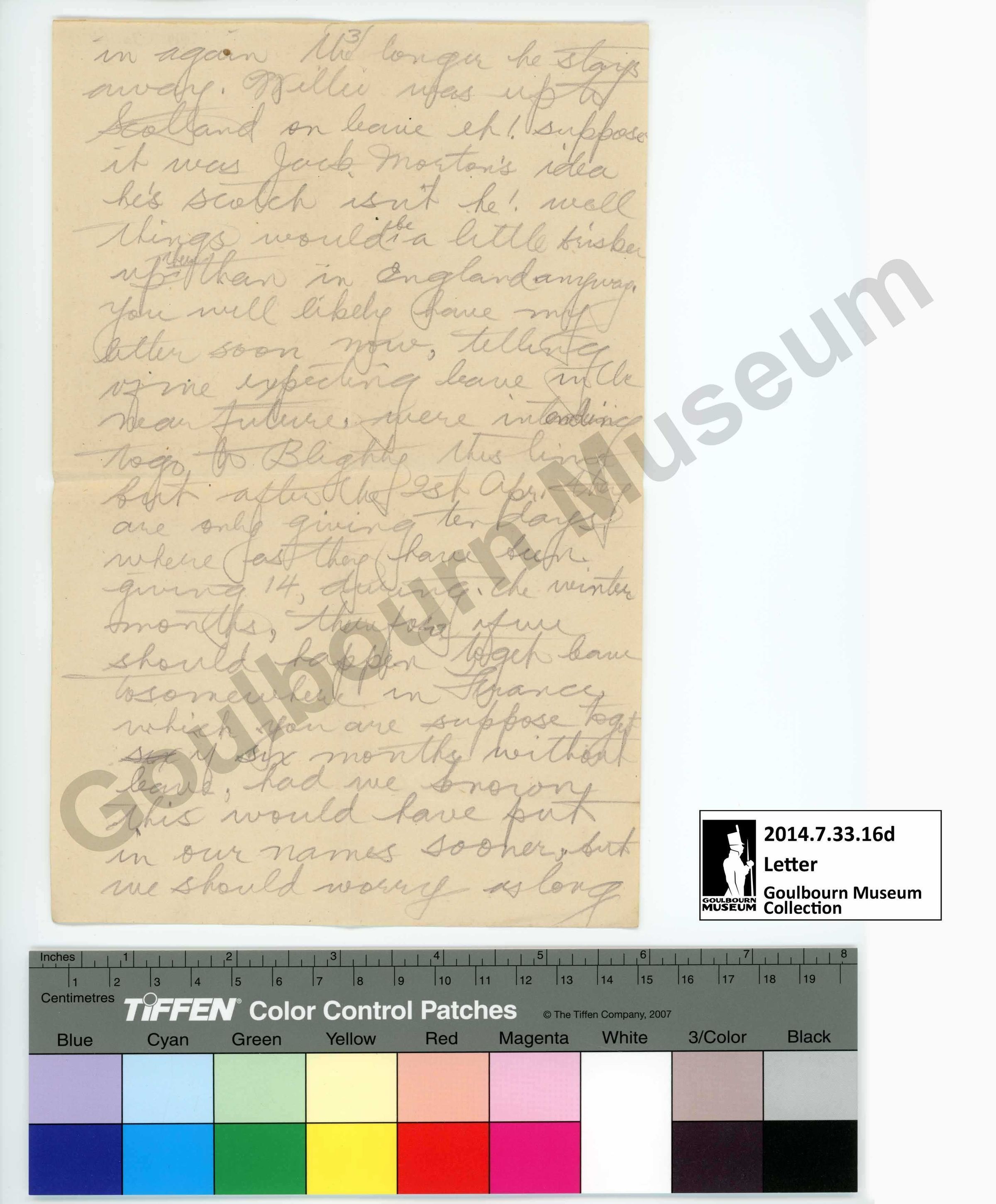 of looking after them, doesn't have to carry anything, hardly knew what to do with them, there being hardly any use of me keeping them [crossed out: me], are too warm to wear now, only wore them about three weeks altogether, then there was really no special need for them, this is such an uncertain life, I mean one day you will be in mud or rain, while the next a person may be free from all such stuff. Deanie said he had seen P. Fox + C. Hall shortly before he saw me, so they are both [illegible: jake] wonder what Channon thinks of the trenches, D. says he's looking about same.