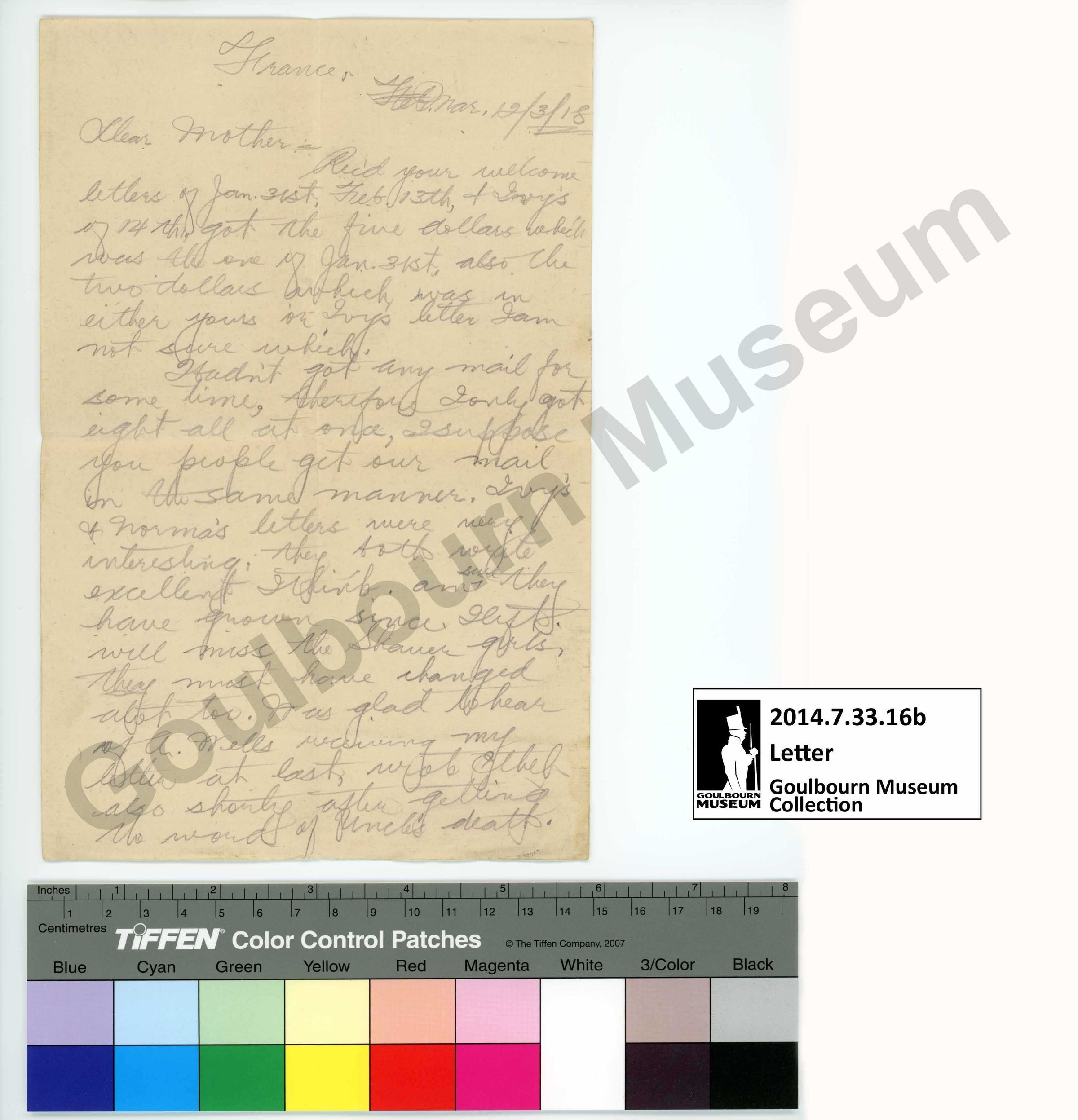 In the case of needing mitts this year there were only a few [crossed out: nec] weeks that there was any necessity for them, of course gloves always come in handy from Fall to Spring. Earl Dobson is very likely home by now, you stated in last letter of him cabling from Liverpool, sure is lucky, suppose you have got my letter asking for money, well leave at present is [with] out, not saying for how long, but the money will be in the bank safe. Must close for now.