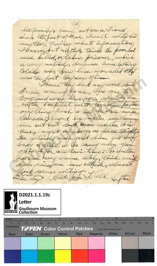 (2) his family, have not seen Lionel since last of Mar. [abbreviated: March] I will write his mother giving what information I know, but rather think the poor lad was killed, or taken prisoner, which is very unlikely, because I was talking to lads who saw him wounded & that was the last they saw of him.