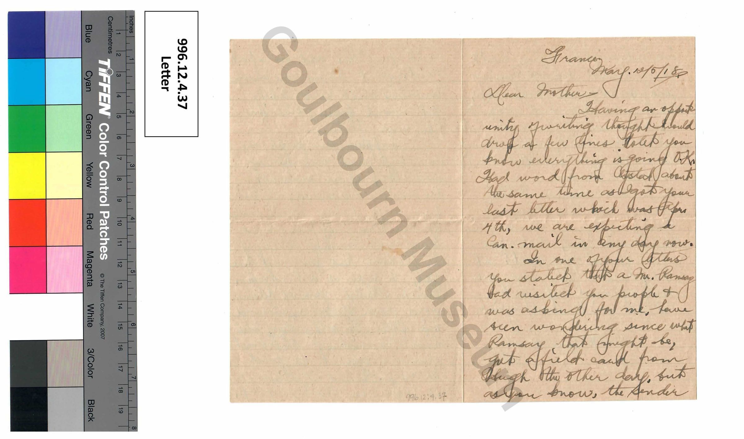 One paper letter consisting of one page, written in cursive handwritten text and preserved in black coloured ink. The letter was written on blank paper and was sent from France, dated May 12, 1918. The letter was written by Richmond, ON resident Pte. Sefton Stewart of the 77th Battalion, Canadian Expeditionary Force who served during the First World War. The letter was addressed to Sefton's mother, Mrs. James Stewart of Richmond, Ontario.Subject Person/Organization