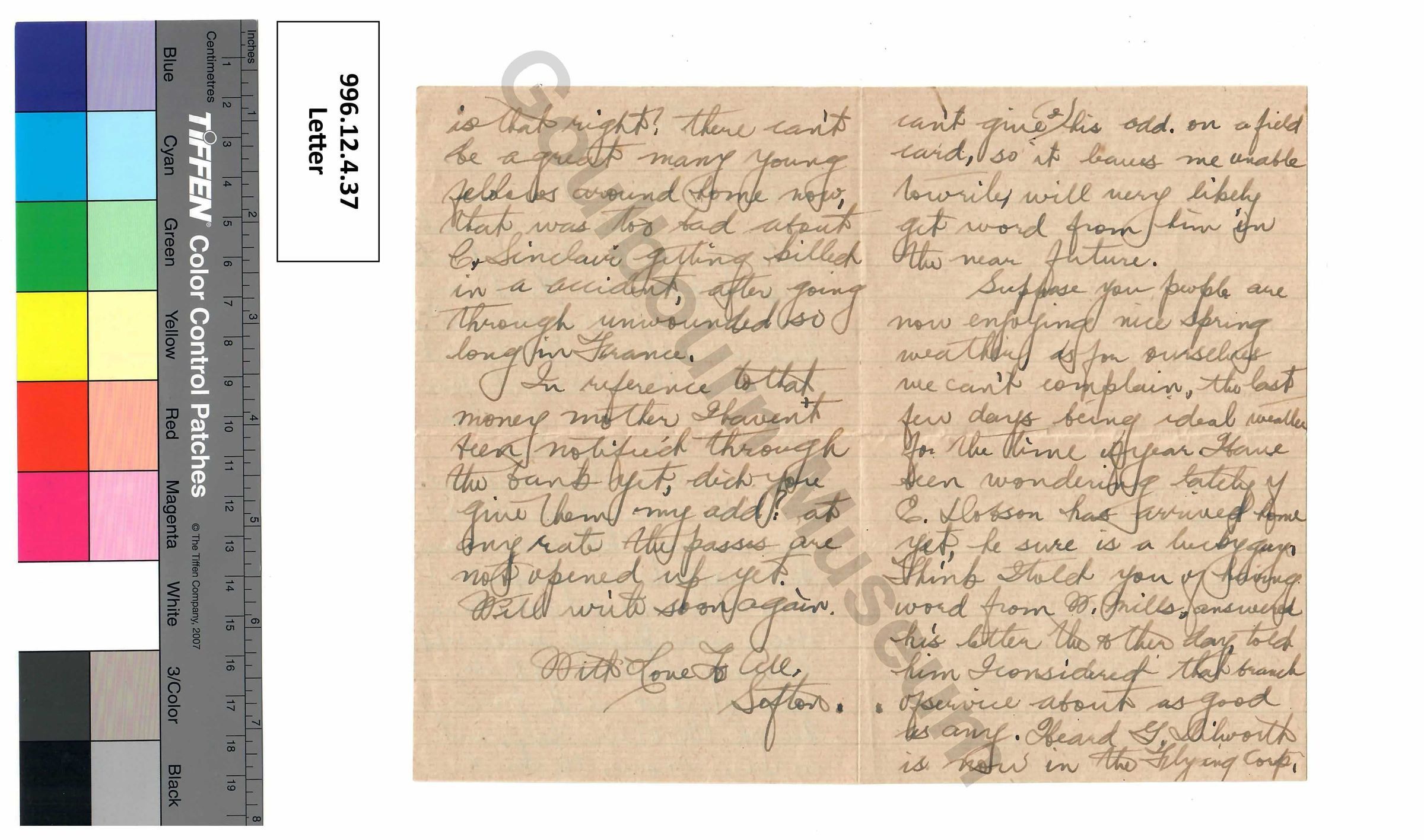 Suppose you people are now enjoying nice spring weather as for ourselves we can’t complain, the last few days being ideal weather for the time of year. Have been wondering lately if C. Dobson has arrived home yet, he sure is a lucky guy. Think I told you of having word from N. Mills, answered his letter the other day, told him I considered that branch of service about as good as any. Heard G. Gilworth is now in the Flying Corp. is that right? there can’t be a great many young fellows around home now, that was too bad about C. Sinclair getting killed in a [spelling error: an] accident, after going through unwounded so long in France.
