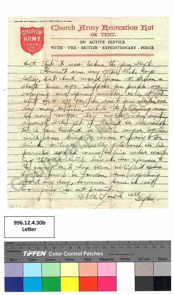 Haven't seen any of the Rich. [Richmond] boys lately, but had word from W. Brecon a short time ago. Suppose you people are enjoying nice spring weather now, it has been wet on + off for. the last few weeks, one day may be fine, while the following may be very rough. Say mother when sending a parcel, I thought it would be advisable to tell you to send a little sugar together with some kind of cocoa or [crossed out: p] any other drink. Metcalfe mostly gets some in his parcels which comes in fine when wanting the odd little lunch. In reference to money Met. [Abbreviation: Metcalfe] has been notified [crossed out: ylas] by the bank in London, I am expecting word any day, however leave is not worrying us at present.
