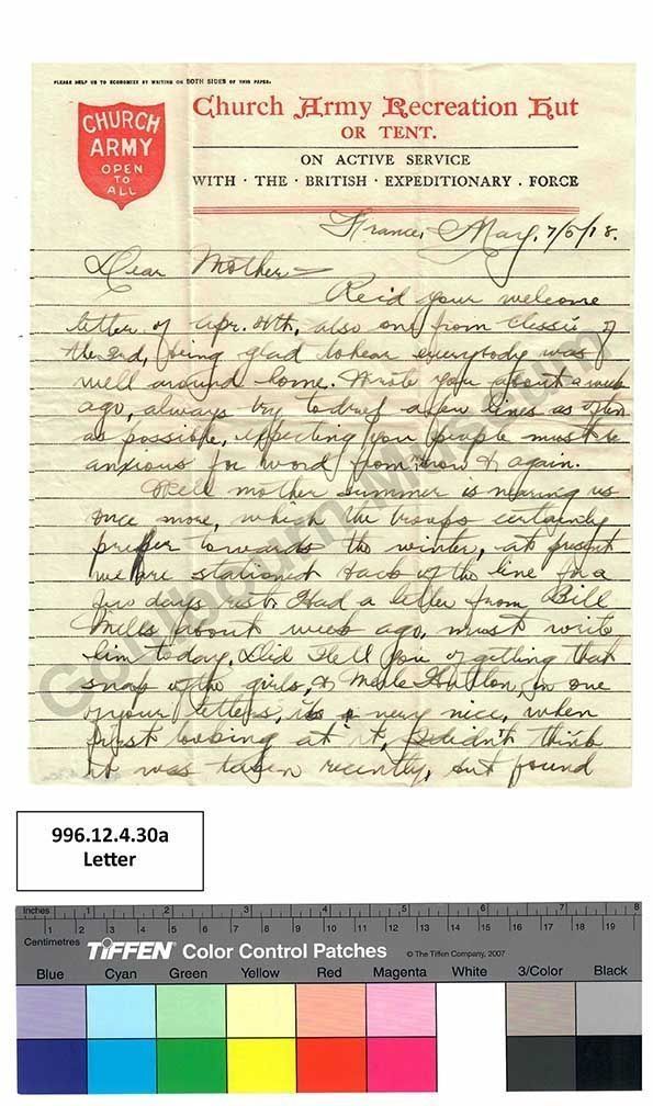 Well mother summer is nearing us once more, which the troops certainly prefer towards the winter, at present we are stationed back of the line for a few days rest. Had a letter from Bill Mills about a week ago. must write him today. Did tell you of getting that snap of the girls, + Merle Hutton, in one of your letters, its [crossed out: a] very nice, when first looking at it. Didn't think it was taken recently, but found