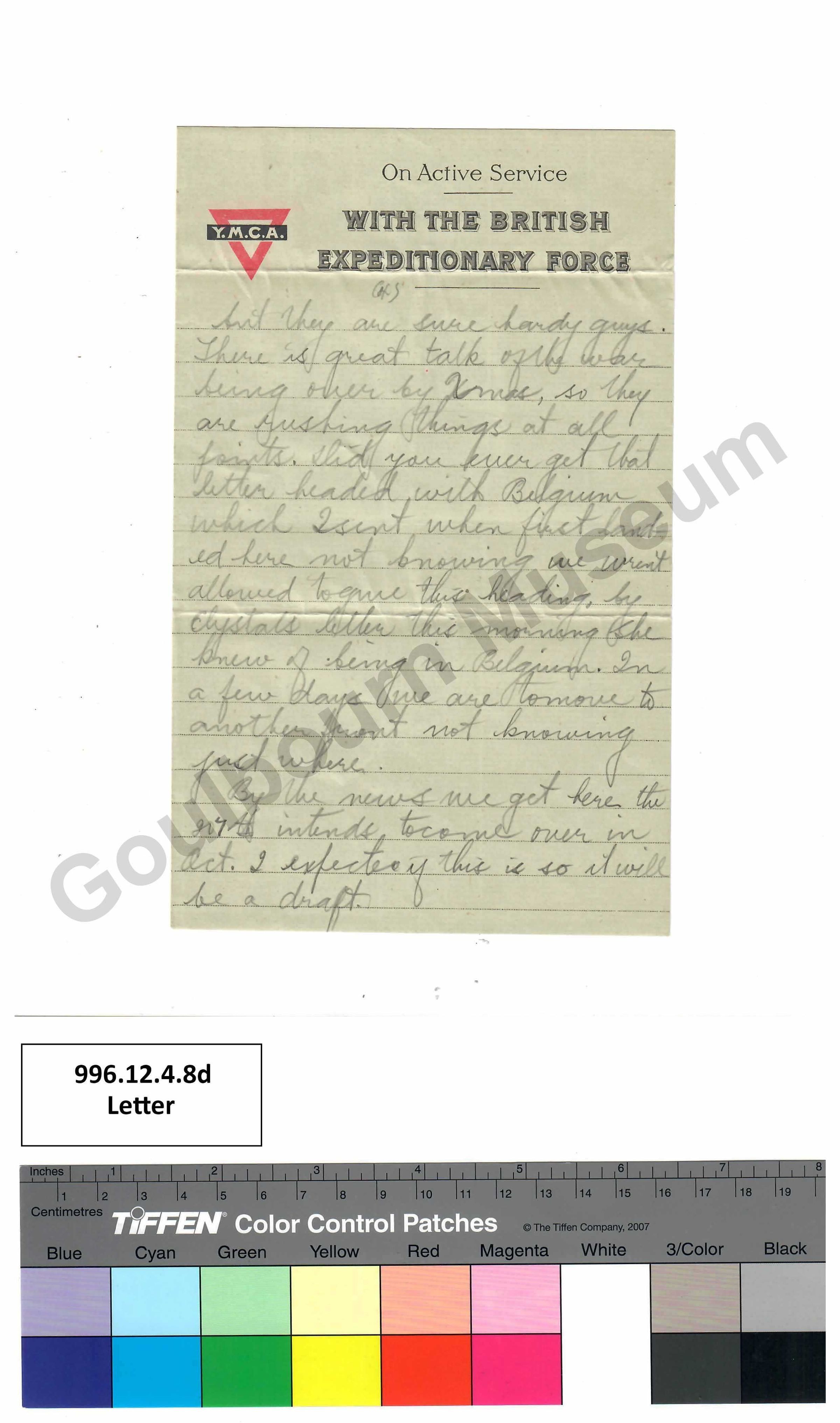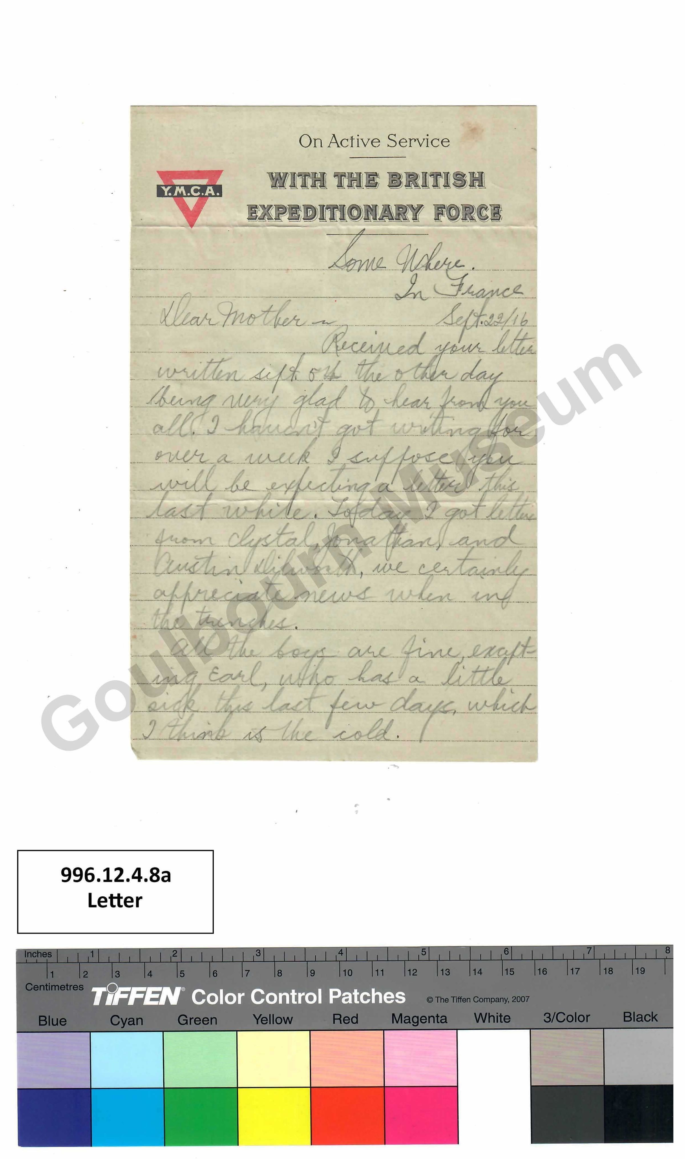 We are now unable to send mail regularly as we were before because it may be left around our quarters before getting the chance of sending it out, besides this as you know it has to be censored by our own officers. How did Pa and George get along with the grain, there must of [spelling error: have] been a splendid crop on the six acres. They are now holding the Germans down very good