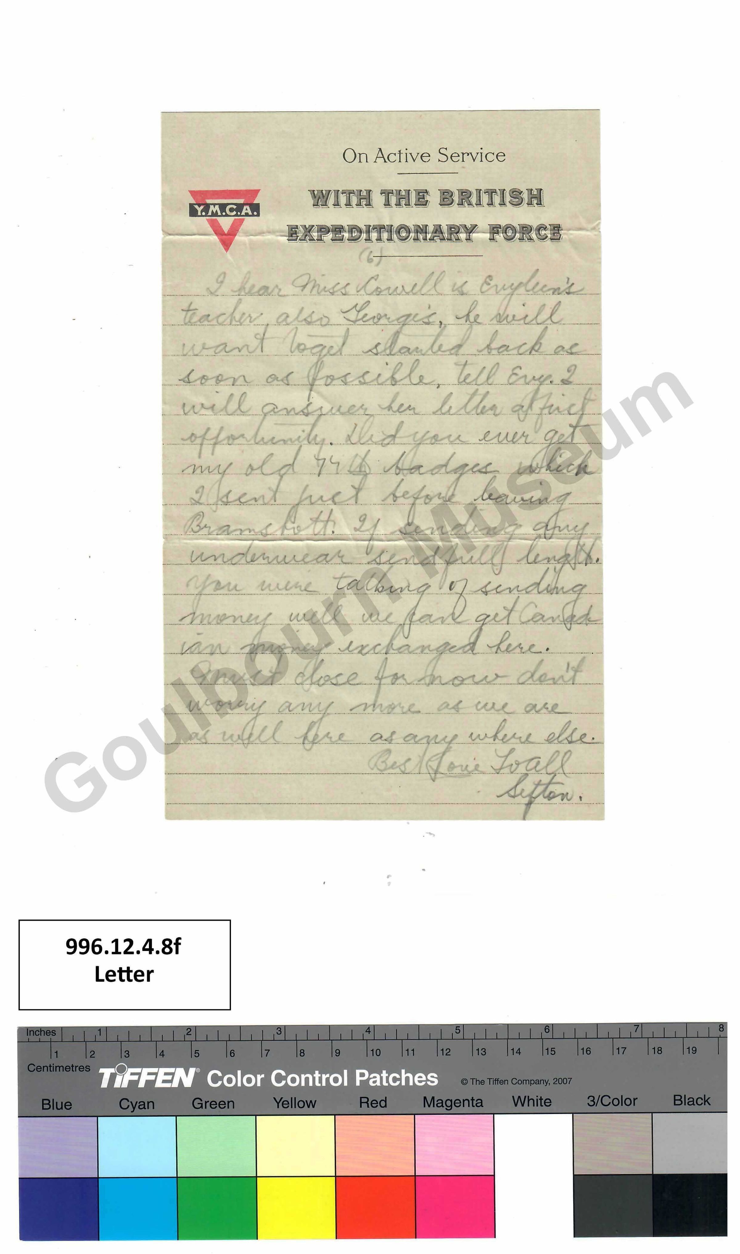 I hear Miss Cowell is Evyleen's teacher also George’s, he will want to get started back as soon as possible, tell Evy. [abbreviated: Evyleen] I will answer her letter at first opportunity. Did you ever get my old 77th badges which I sent just before leaving Bramshott. If sending any underwear send full length. You were talking of sending money well we can get Canadian money exchanged here. Must close for now don't worry any more as we are as well here as anywhere else.