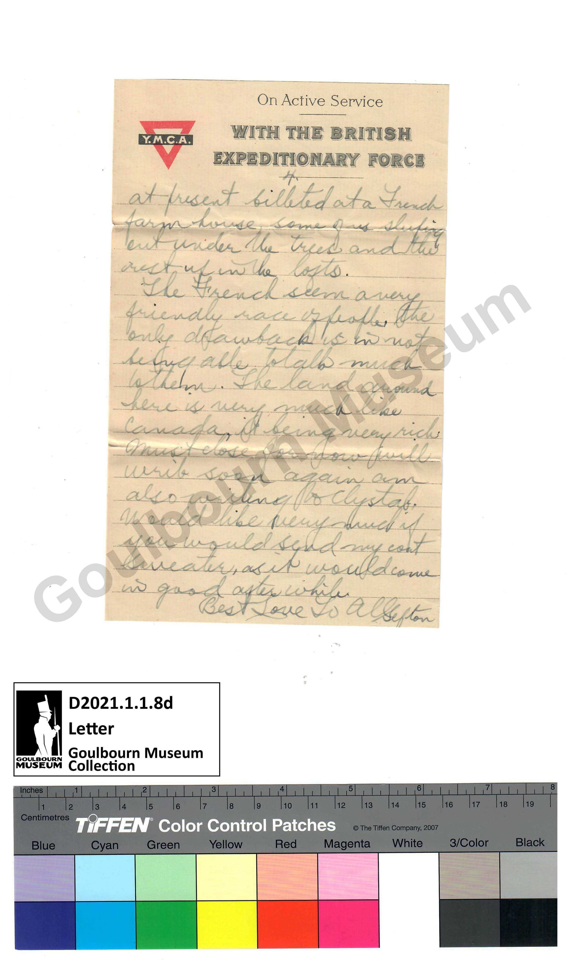 The French seem a very friendly race of people, the only drawback is in not being able to talk much to them. The land around here is very much like Canada, it being very rich. Must close for now will write soon again am also writing to Clystal. Would like very much if you would send my coat sweater, as it would come in good after while.