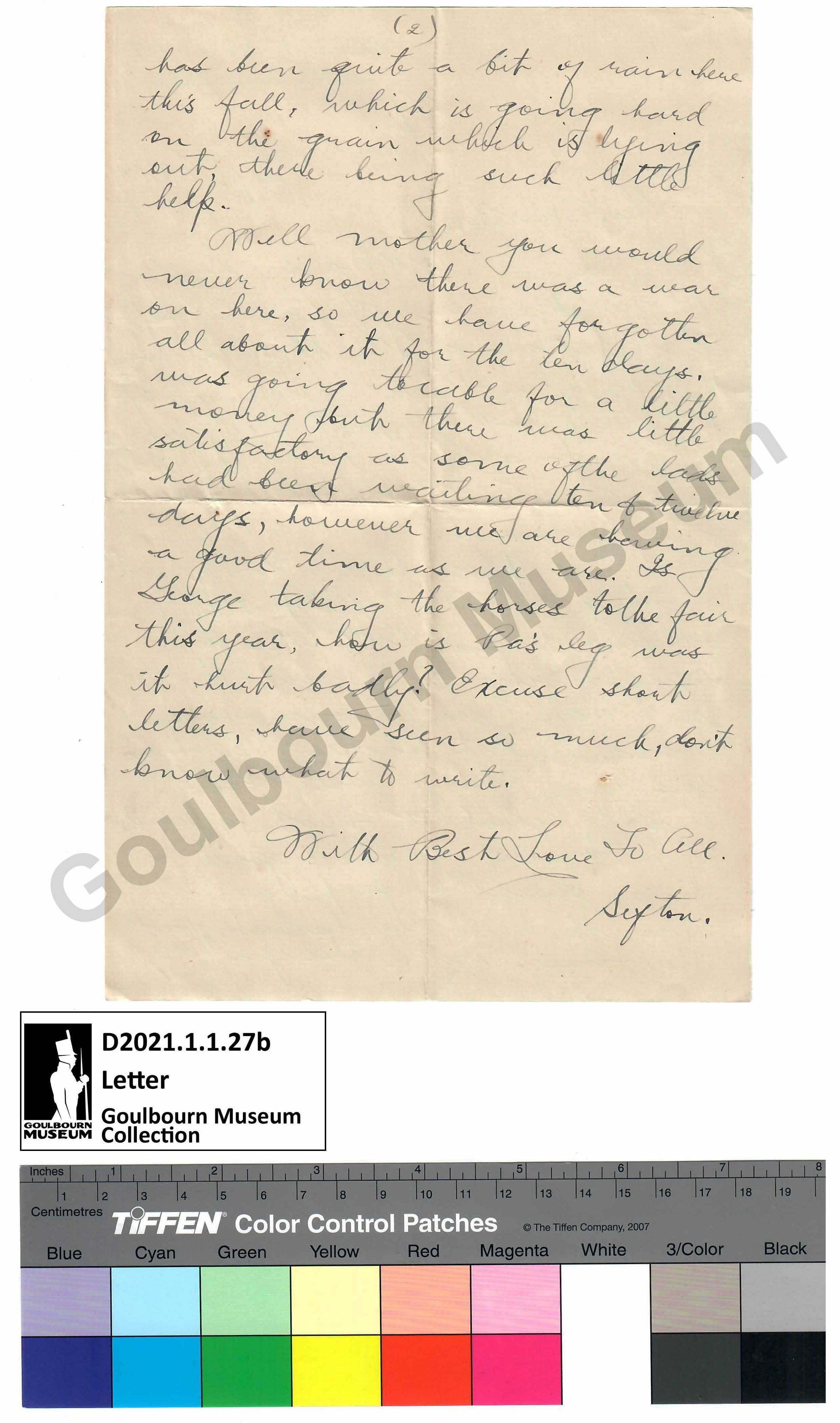 Letter from the First World War collection of written letters by Sefton Stewart, a Richmond, Ontario resident who served with the Canadian Expeditionary Force during the Great War.Collection