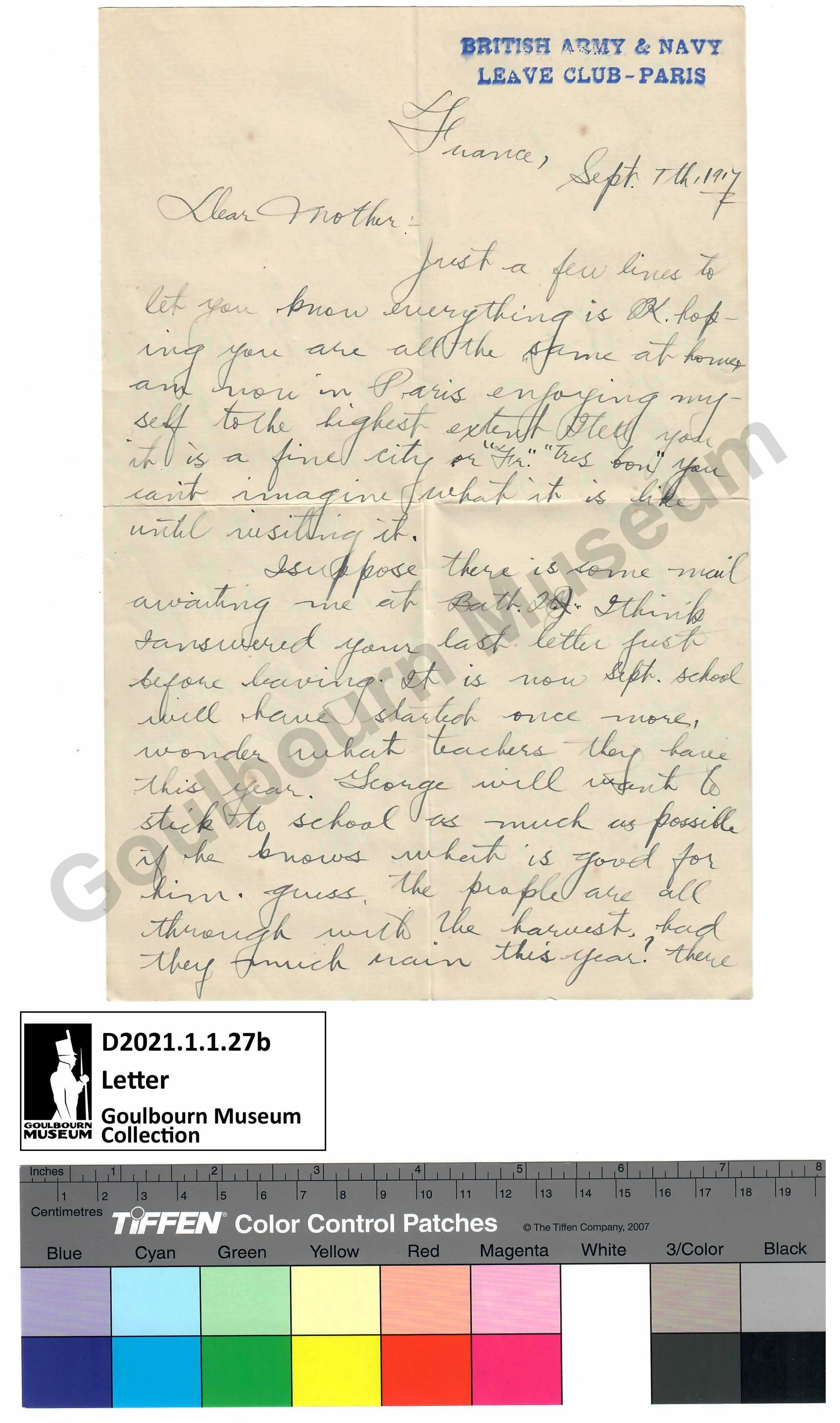 Digital Artifact: One envelope containing a letter composed of one page. Written on British Army & Navy Leave Club Paris letter-headed paper in black coloured ink. The message was written by Richmond, ON resident Pte. Sefton Stewart while serving in the 13th Battalion Royal Highlanders of Canada in France during the First World War. Addressed to Mrs. Jas. Stewart Richmond, postmarked army post office 7 SP 17.Subject Person/Organization