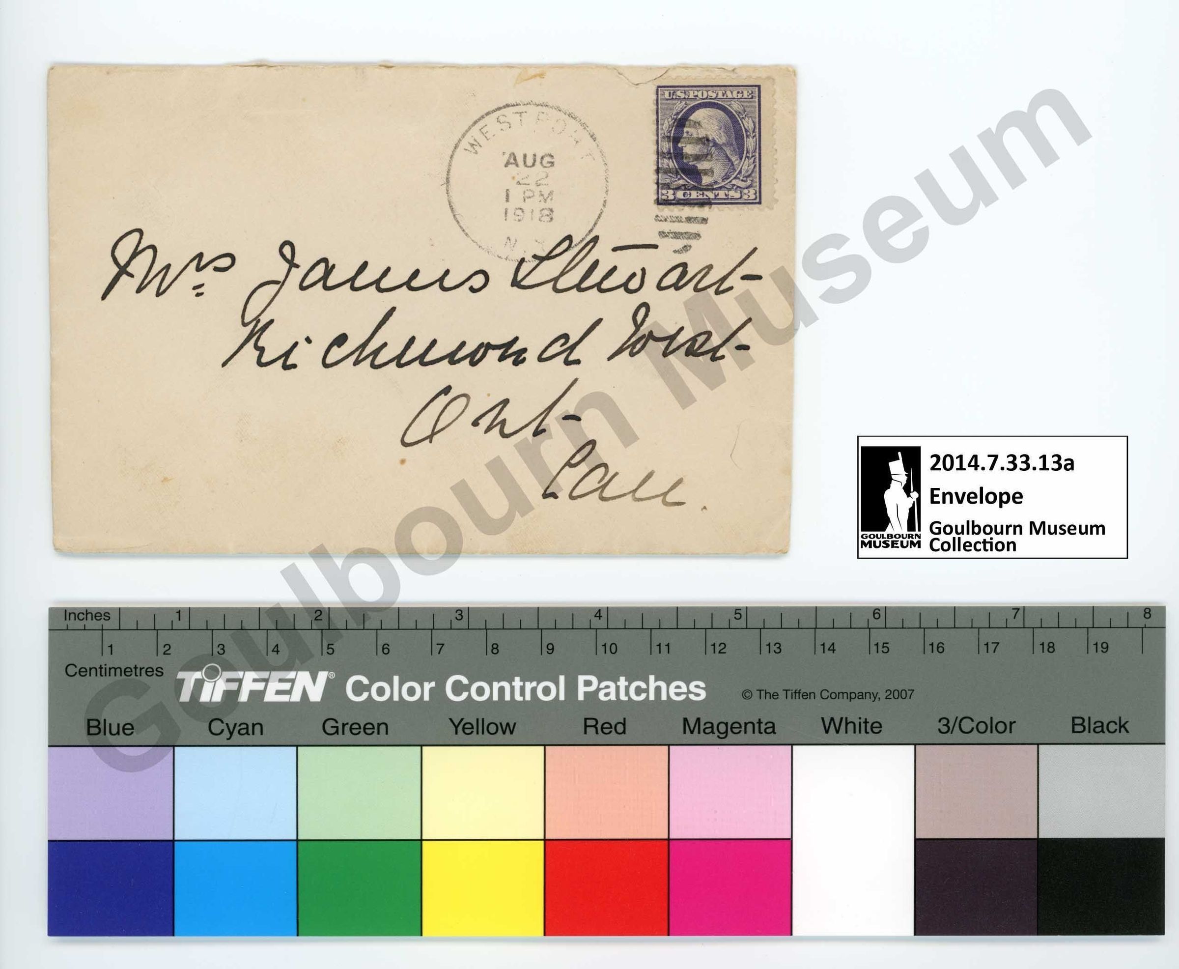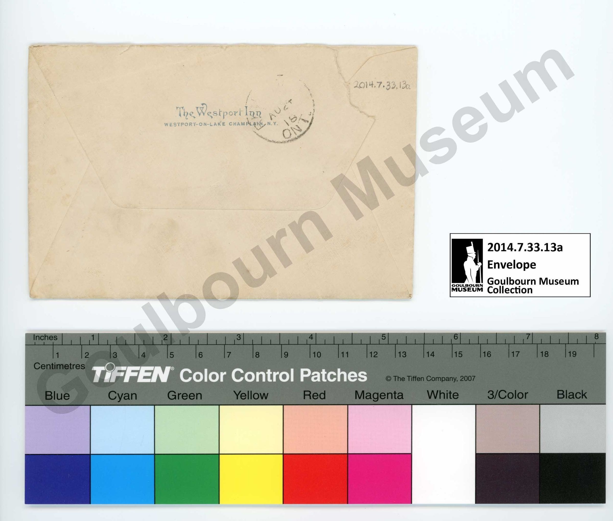 The envelope, 2014.7.33.13a, is made of a cream colored paper that has been folded into shape. It is held together within an unknown adhesive. An inscription on the front in a dark black ink, handwritten in cursive, reads "Mrs. James Stewart- Richmond, West- Ont- Can". There is a rectangular postage stamp on the proper top left corner of the front featuring a male face facing to the proper right flanked by a laurel wreathe, and the words "U.S. POSTAGE" and "3CENTS3" appearing above and below the face respectively. There are two rubber stamp imprints on the front rendered in black ink located in the proper top left quadrant. The first, closer to center, presents as a circle with text inside which reads "WEST PORT AUG 22 1 PM 1918". The second stamp partly overlies the postage stamp; it is an oval comprised of horizontal bands of black ink with negative space between. On the back there is a printed inscription in a faint blue ink at the top center of the top fold which reads "The Westport Inn WESTPORT-ON-LAKE CHAMPLAIN N.Y." There is a single rubber stamp imprint on the back located at the top center which a slight bias towards the proper right side; it partly overlies the printed inscription. The stamp is rendered in black ink which presents as a circle with text within. The text inside the stamp on the back is mostly faded, particularly at the top, but the phrase "18 ONT" is visible at the bottom.