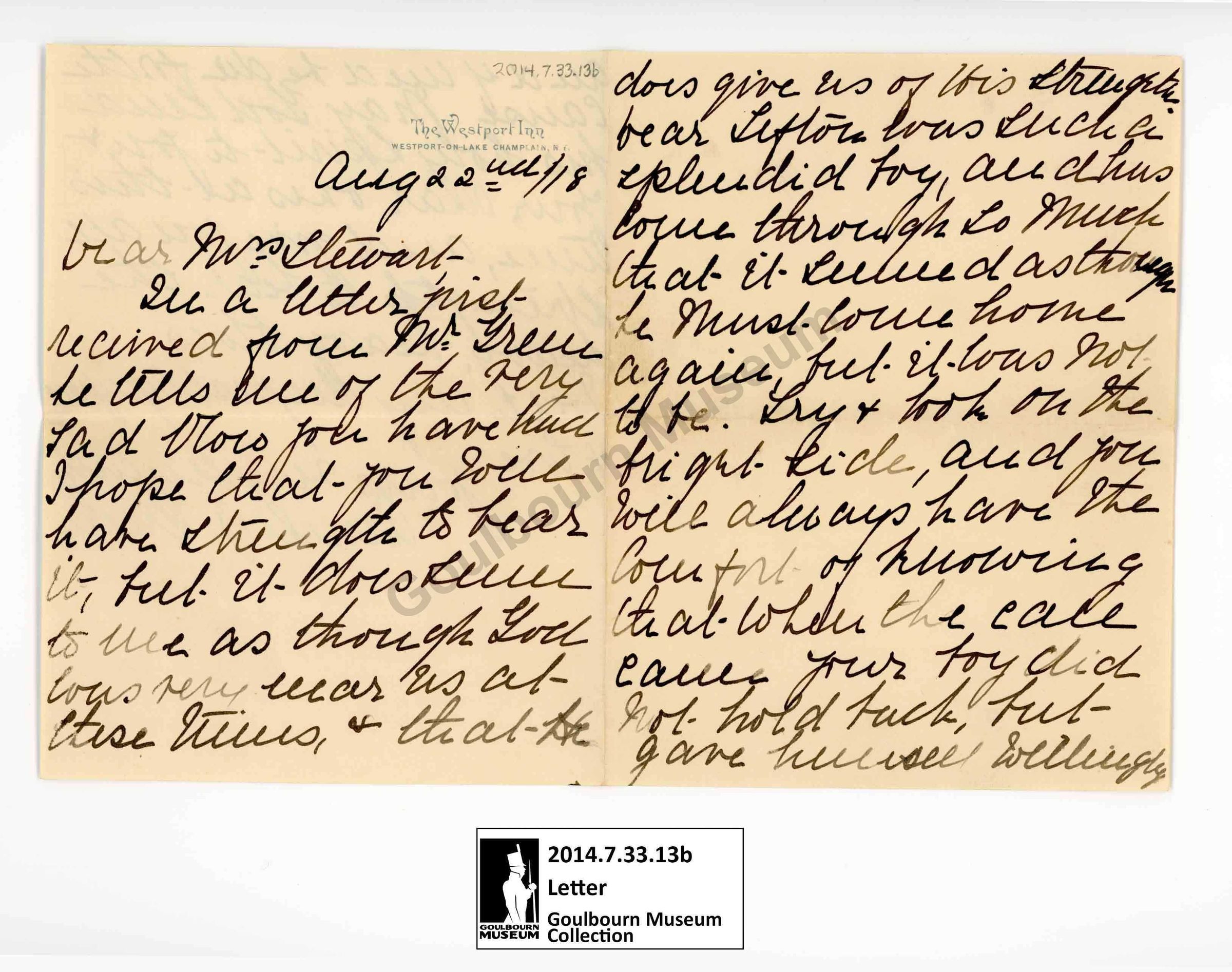 2014.7.33.13b is a letter which spans the entire front and the proper right half of the back of a single piece of paper. The support is a cream colored paper. The medium is a very dark black handwritten ink, rendered in a unique cursive style which is very difficult to read; the ink is visible from the other side of the paper. There is a printed letterhead on the front of the letter located at the top of the proper right half of the page, rendered in blue ink. The letterhead reads "The Westport Inn WESTPORT-ON-LAKE CHAMPLAIN N.Y.". The letterhead and printed inscription on the back of the envelope are identical. The letter begins with the phrase "In a letter just received from..."Subject Person/Organization