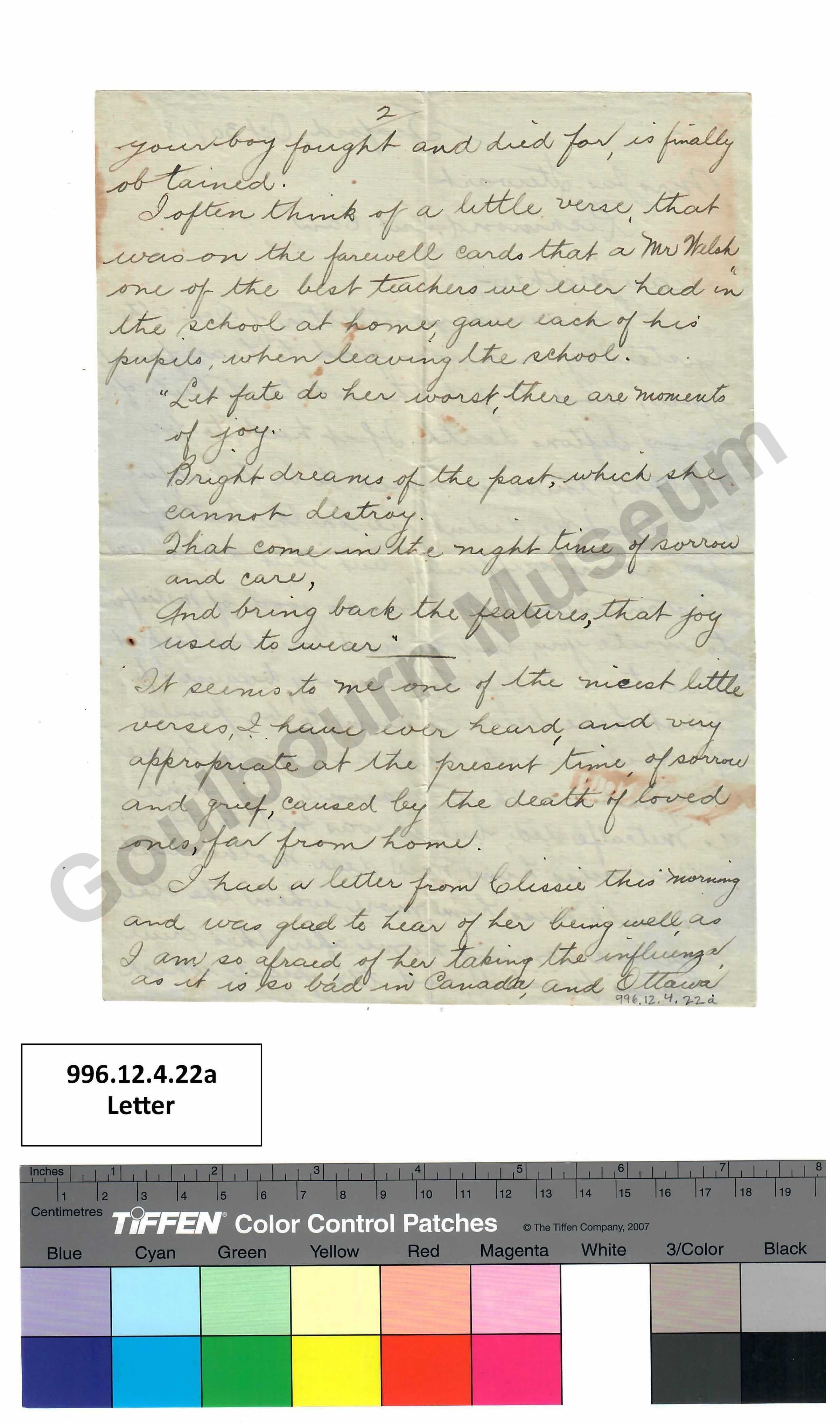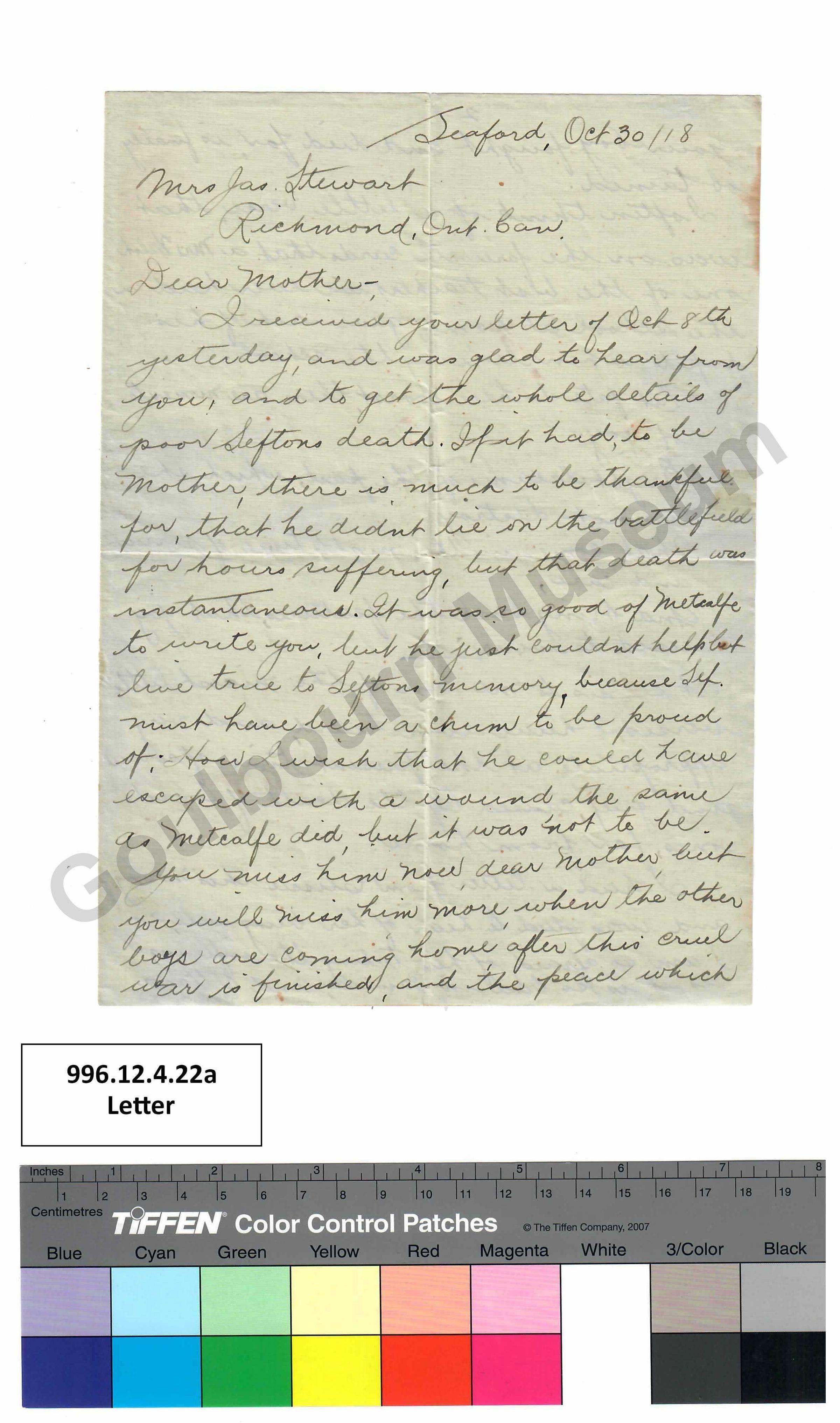 I received your letter of Oct 8th yesterday, and was glad to hear from you, and to get the whole details of poor Seftons death. If it had, to be mother, there is much to be thankful for, that he didnt lie on the battlefield for hours suffering, but that death was instantaneous. It was so good of Metcalfe to write you, but he just couldnt help but live true to Seftons memory, because Sef [abbreviated: Sefton] must have been a chum to be proud of. How I wish that he could have escaped with a wound the same as Metcalfe did, but it was not to be. You miss him now dear mother but you will miss him more when the other boys are coming home after this cruel war is finished, and the peace which