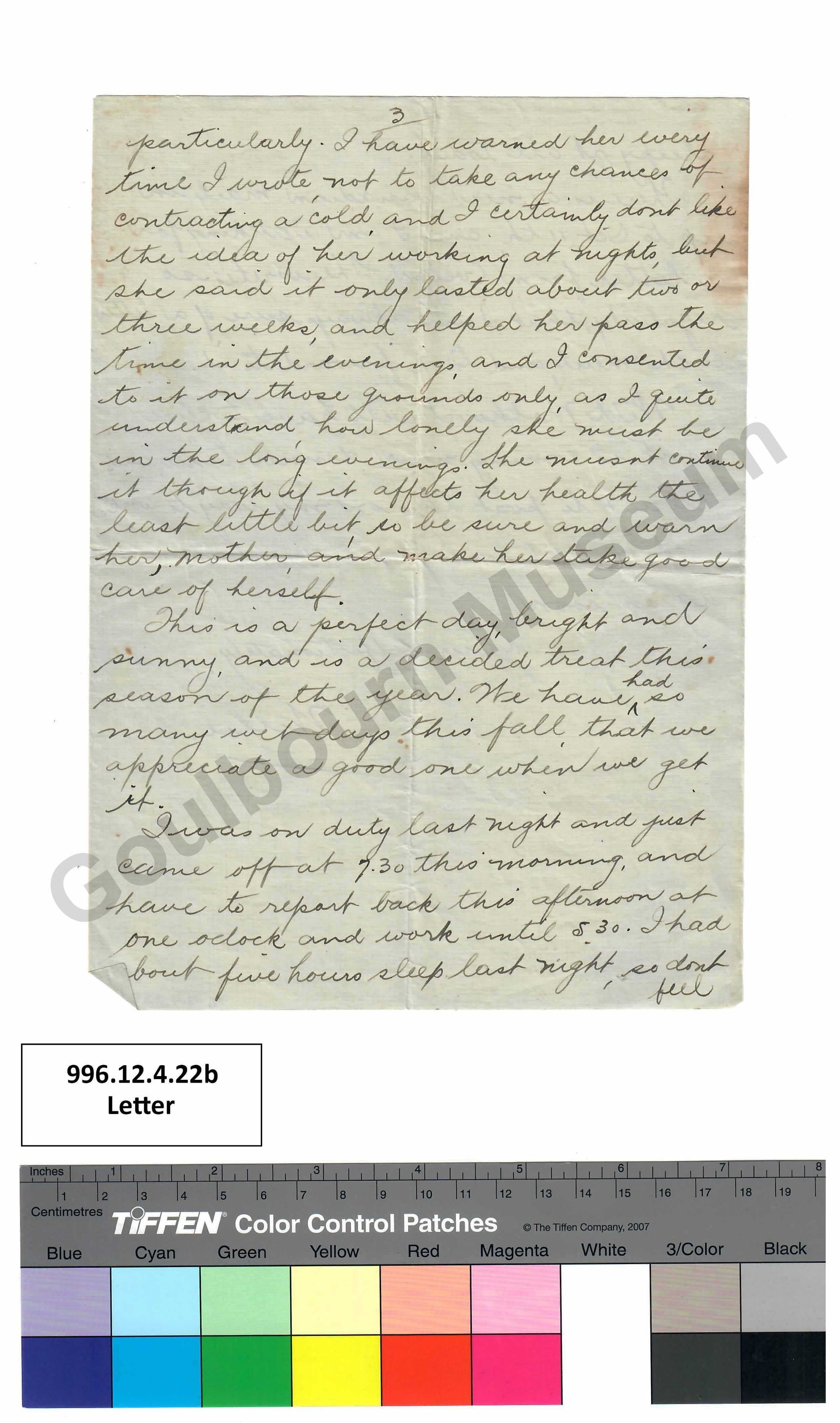 particularly. I have warned her every time I wrote, not to take any chances of contracting a cold, and I certainly dont like the idea of her working at nights, but she said it only lasted about two or three weeks, and helped her pass the time in the evenings , and I consented to it on those grounds only, as I quite understand how lonely she must be in the long evenings. She musnt continue it though if it affects her health the least little bit, so be sure and warn her, Mother, and make her take good care of herself.
