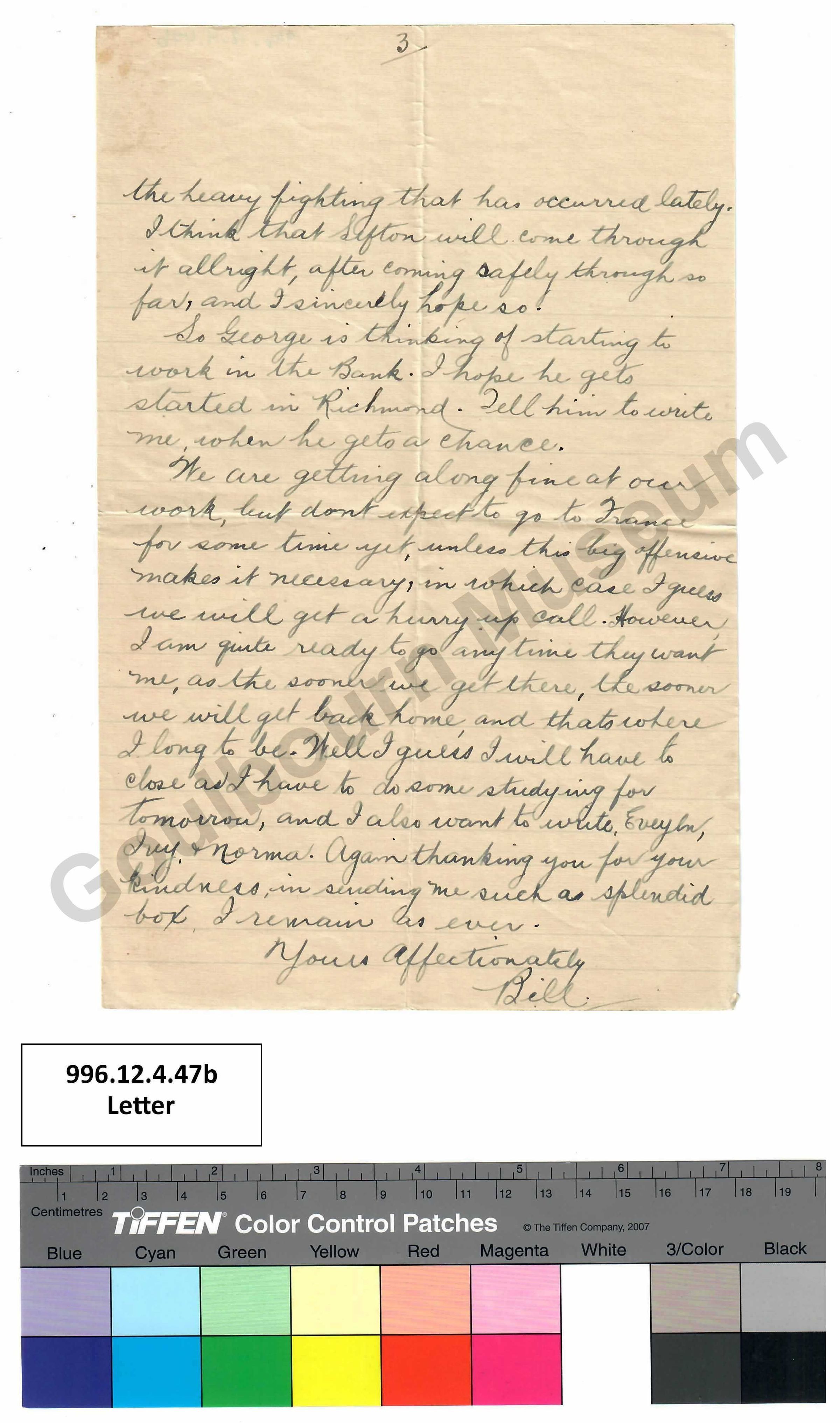 We are getting along fine at our work, but dont [spelling error: don’t] expect to go to France for some time yet, unless this big offensive makes it necessary, in which case I guess we will get a hurry up call. However, I am quite ready to go any time they want me, as the sooner we get there, the sooner we will get back home, and thats [spelling error: that’s] where I long to be. Well I guess I will have to close as I have to do some studying for tomorrow, and I will also want to write Eveyln, Ivy, & Norma. Again thanking you for your kindness in sending me such a splendid box. I remain as ever