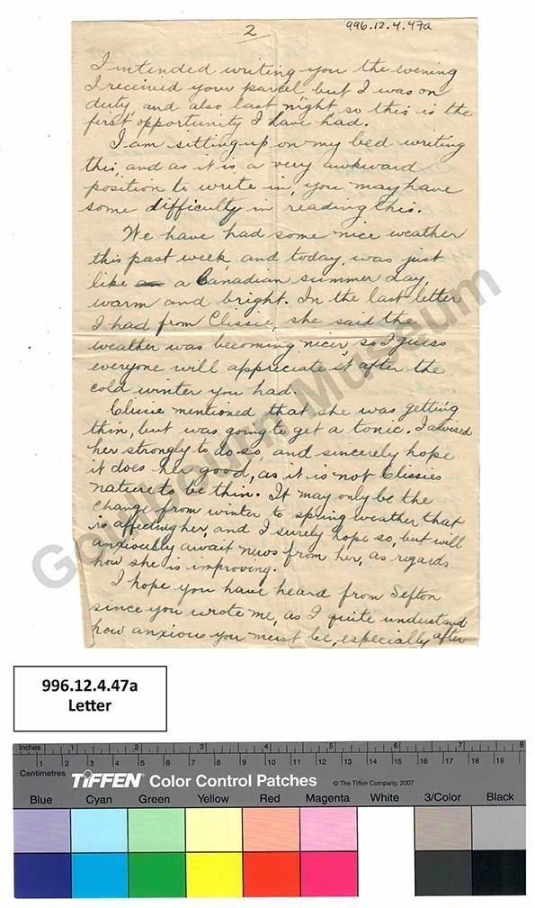 We have had some nice weather this past week, and today, was just like [crossed out: an] a Canadian summer day, warm and bright. In the last letter I had from Clissie, she said the weather was becoming nicer, so I guess everyone will appreciate it after the cold winter you had.