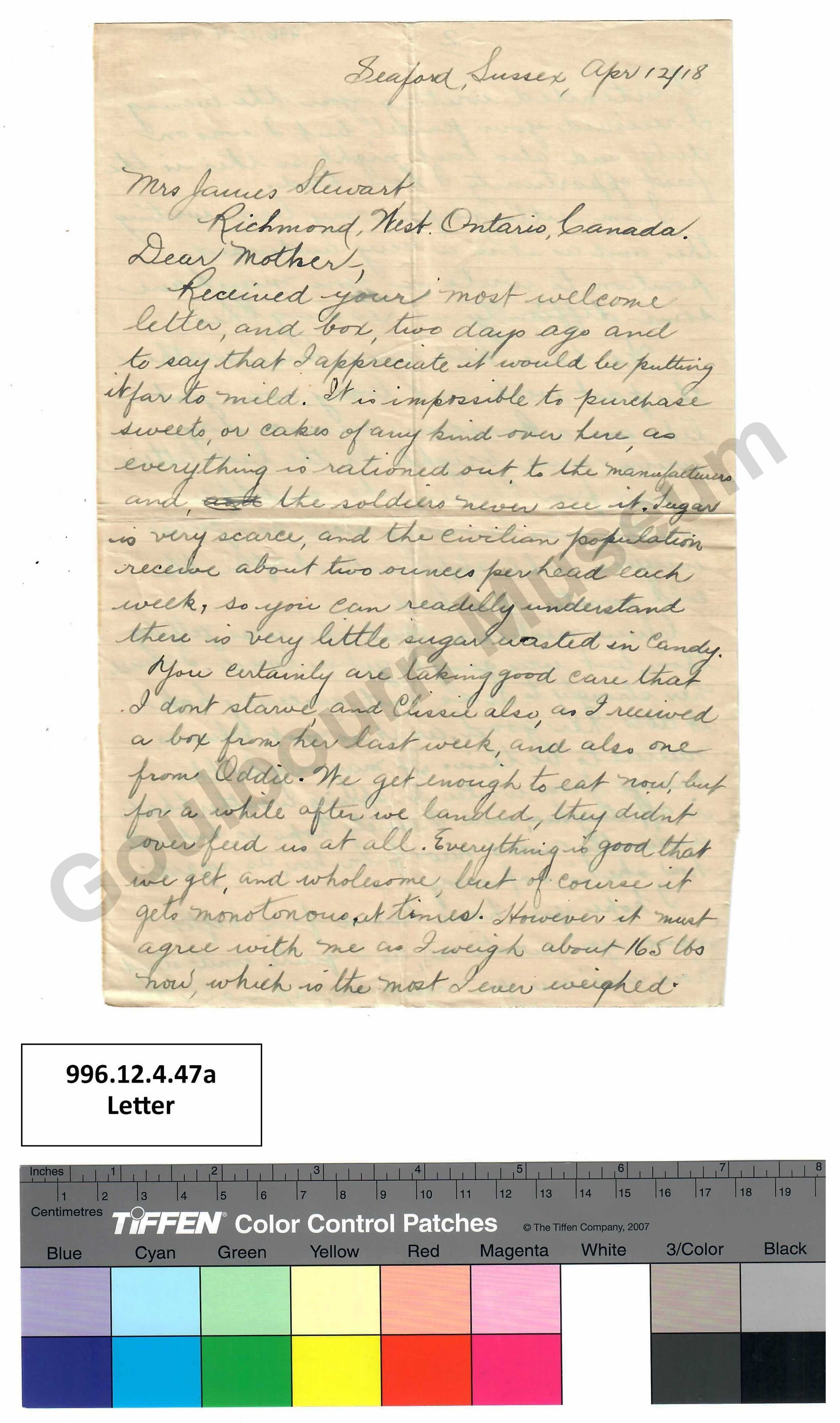 Received your most welcome letter, and box, two days ago and to say that I appreciate it would be putting it far to [spelling error: too] mild. It is impossible to purchase sweets, or cakes of any kind over here, as everything is rationed out to the manufacturers and, [crossed out: and] the soldiers never see it. Sugar is very scarce, and the civilian population receive about two ounces per head each week, so you can readilly [spelling error: readily] understand there is very little sugar wasted in candy.