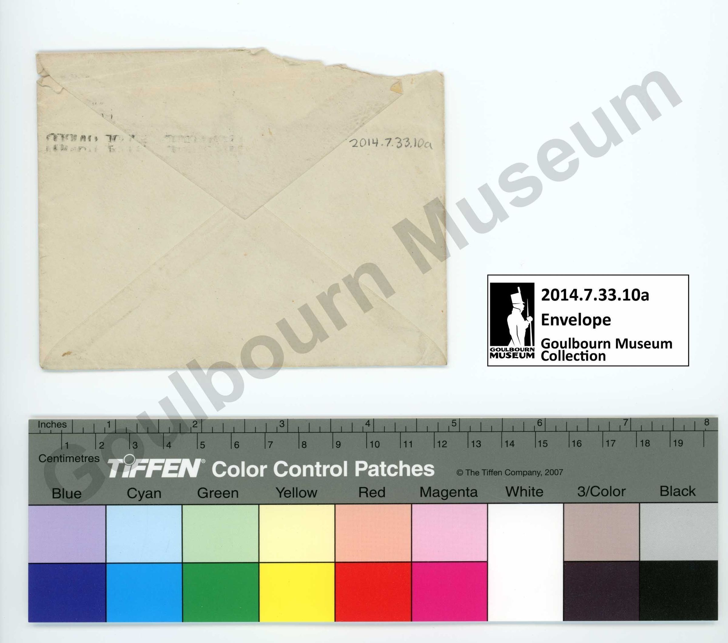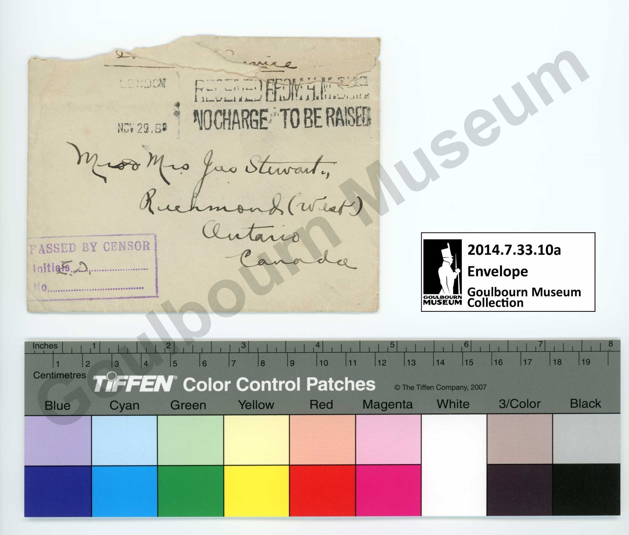 2014.7.33.10a, the envelope, is made of a piece of cream/tan colored paper that has been folded into shape. It is held together with an unknown adhesive. There is an inscription in a handwritten black ink, rendered in cursive, at the center which reads "Mr. and Mrs. Jas. Stewart, Richmond (West), Ontario Canada". Another inscription at the top is badly damaged by the torn support and is illegible. There are two, possibly three, rubber stamp imprints. The first occurs on the proper bottom right corner and is rendered in blue ink. This imprint presents as a rectangle in which the words "PASSED BY CENSOR" "INITIALS" AND NO" appear. The initials field has been filled in with a black handwritten medium which reads "E.D." A second rubber stamp imprint occurs at the top center and bears two lines reading "LONDON NOV 29, 8". A third rubber stamp imprint occurs in the proper top left quadrant and reads in part "RECIEVED FROM HMS" and "NO CHARGE TO BE RAISED". It is unknown whether the second and third stamp imprints are separate stamps or part of a single larger one. There is a single incomplete stamp imprint on the back of the envelope in the top proper left quadrant rendered in black ink. This imprint appears to be a line of characters, possibly in reverse, that has been bisected along the horizontal midpoint.