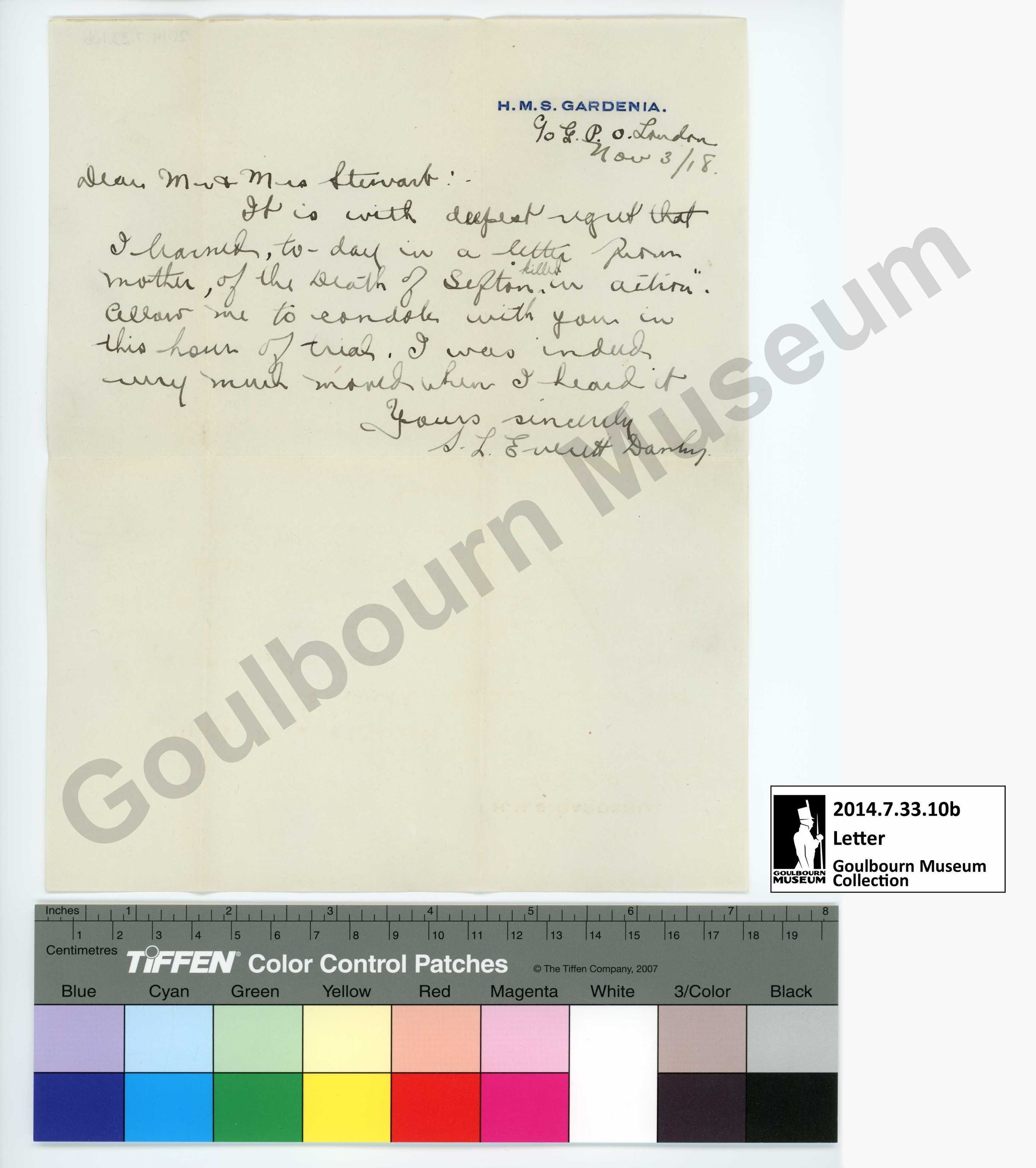 H.M.S.GARDENIA. c/o [abbreviated: care of] G.P.O. [abbreviated: General Post Office] London Nov 3/18 [abbreviated: November 3, 1918] Dear Mr & Mrs Stewart: - It is with deepest regret that I learned, to-day in a letter from mother, of the Death of Sefton ""killed in action"". Allow me to condole with you in this hour of trial. I was indeed very much moved when I heard it. Yours sincerely S. L. Everett Danby