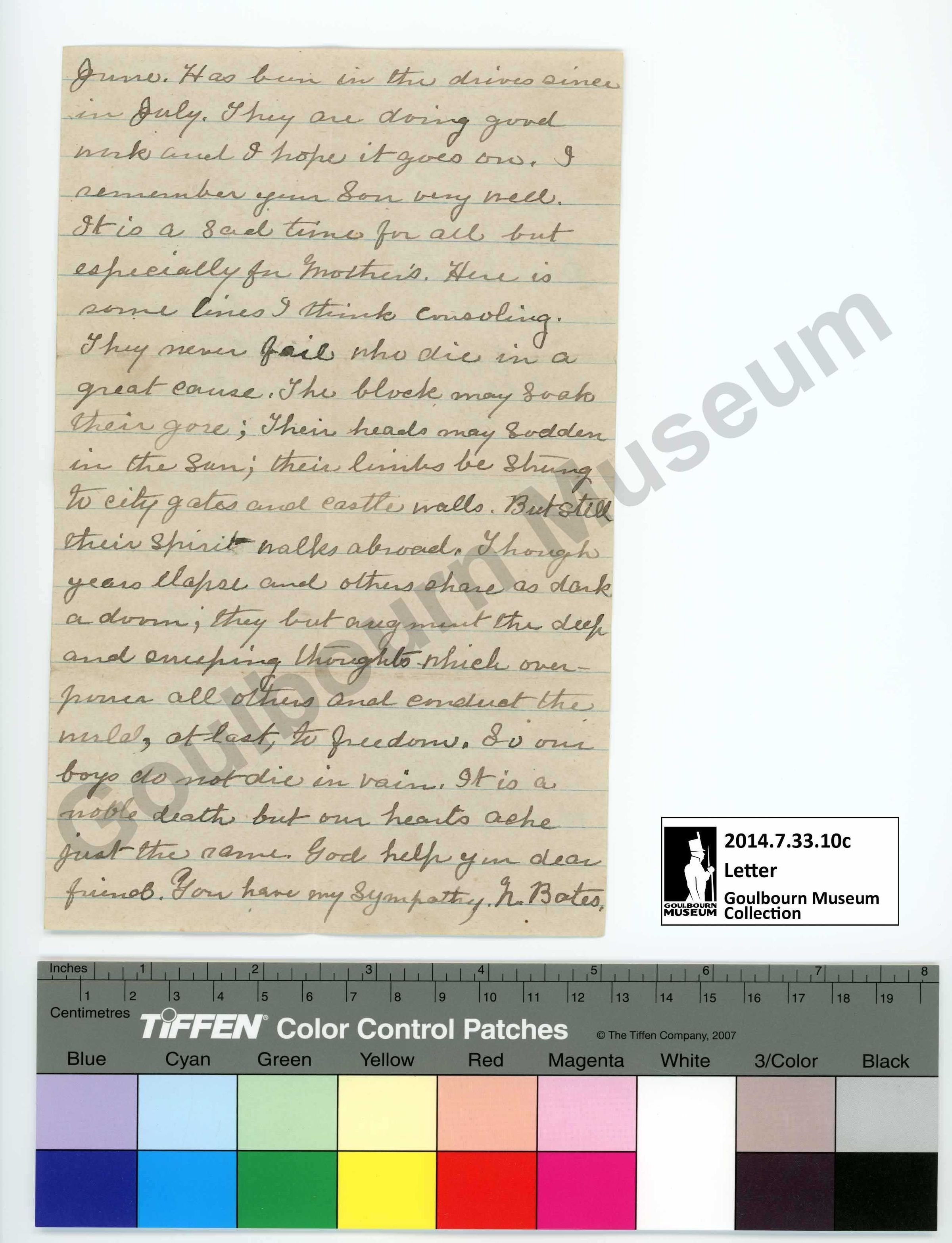 June. Has been in the drives since in July. They are doing good work and I hope it goes on. I remember your Son very well. It is a Sad time for all but especially for Mother's. Here is some lines I think consoling. They never fail who die in a great cause. The block may Soak their gore; Their heads may Sodden in the Sun; their limbs be strung to city gates and castle walls. But still their Spirit walks abroad. Though years elapse and others share as dark a dorm; they but augment the deep and sweeping thoughts which overpower all others and conduct the [nulal], at last, to freedom. So our boys do not die in vain. It is a noble death but our hearts ache just the same. God help you dear friend. You have my Sympathy. N. Bates.Transcriber