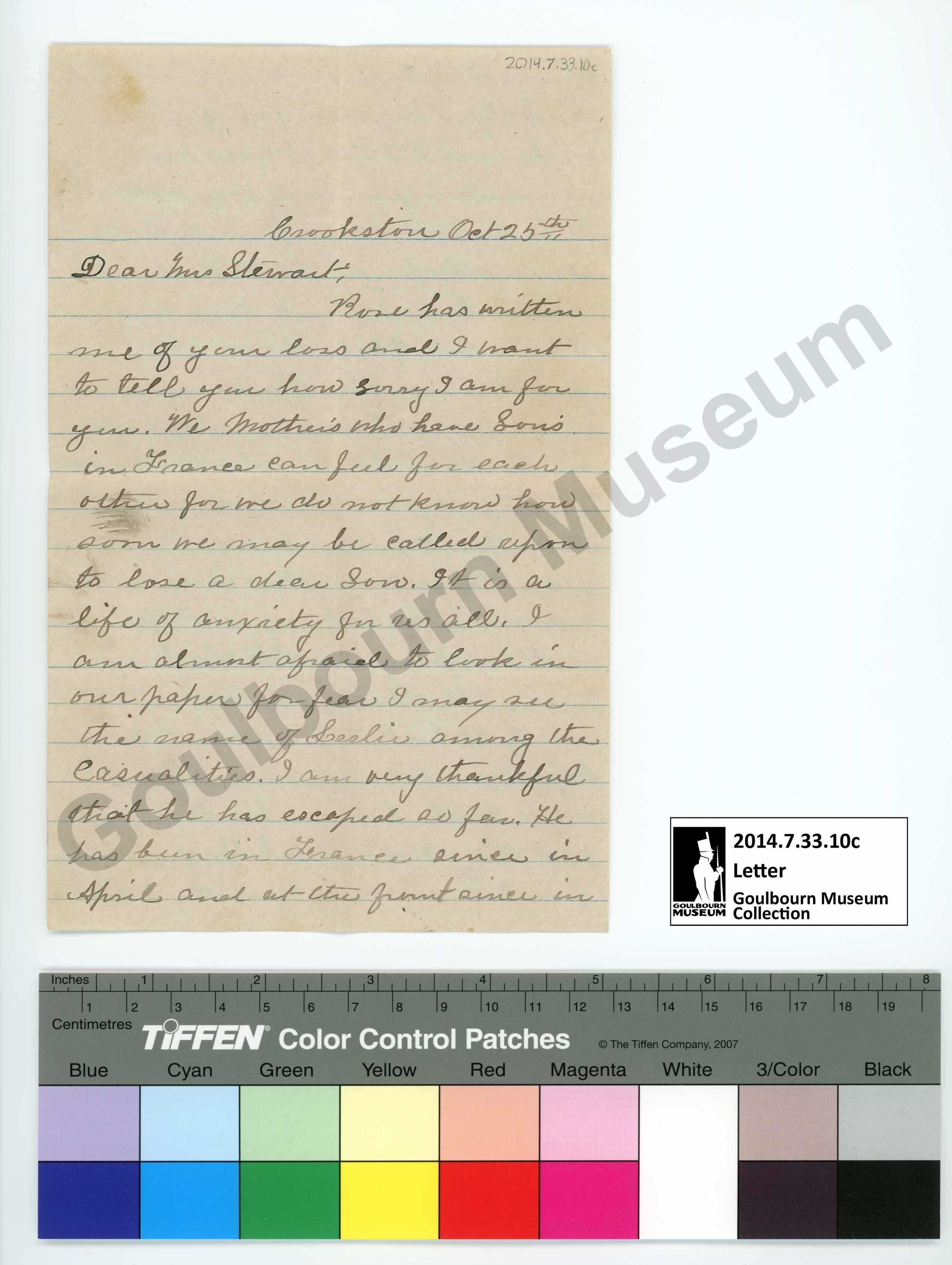 Crookston Oct 25th [abbreviated: October 25] Dear Mrs Stewart, Rose has written me of your loss and I want to tell you how sorry I am for you. We Mother's who have Sons' in France can feel for each other for we do not know how soon we may be called upon to lose a dear Son. It is a life of anxiety for us all. I am almost afraid to look in our paper for fear I may see the name of Leslie among the Casualties. I am very thankful that he has escaped so far. He has been in France since in April and at the front since in