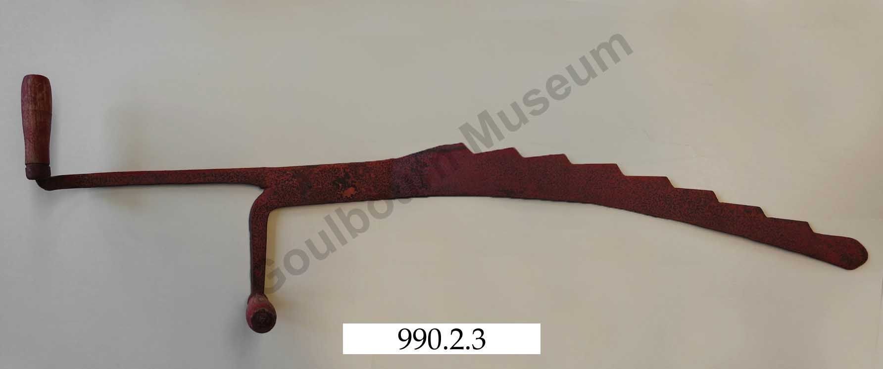 Metal Lightening Hay Knife with two wooden handles and red paint. Red metal blade with wooden handles, blade is made in a jagged style