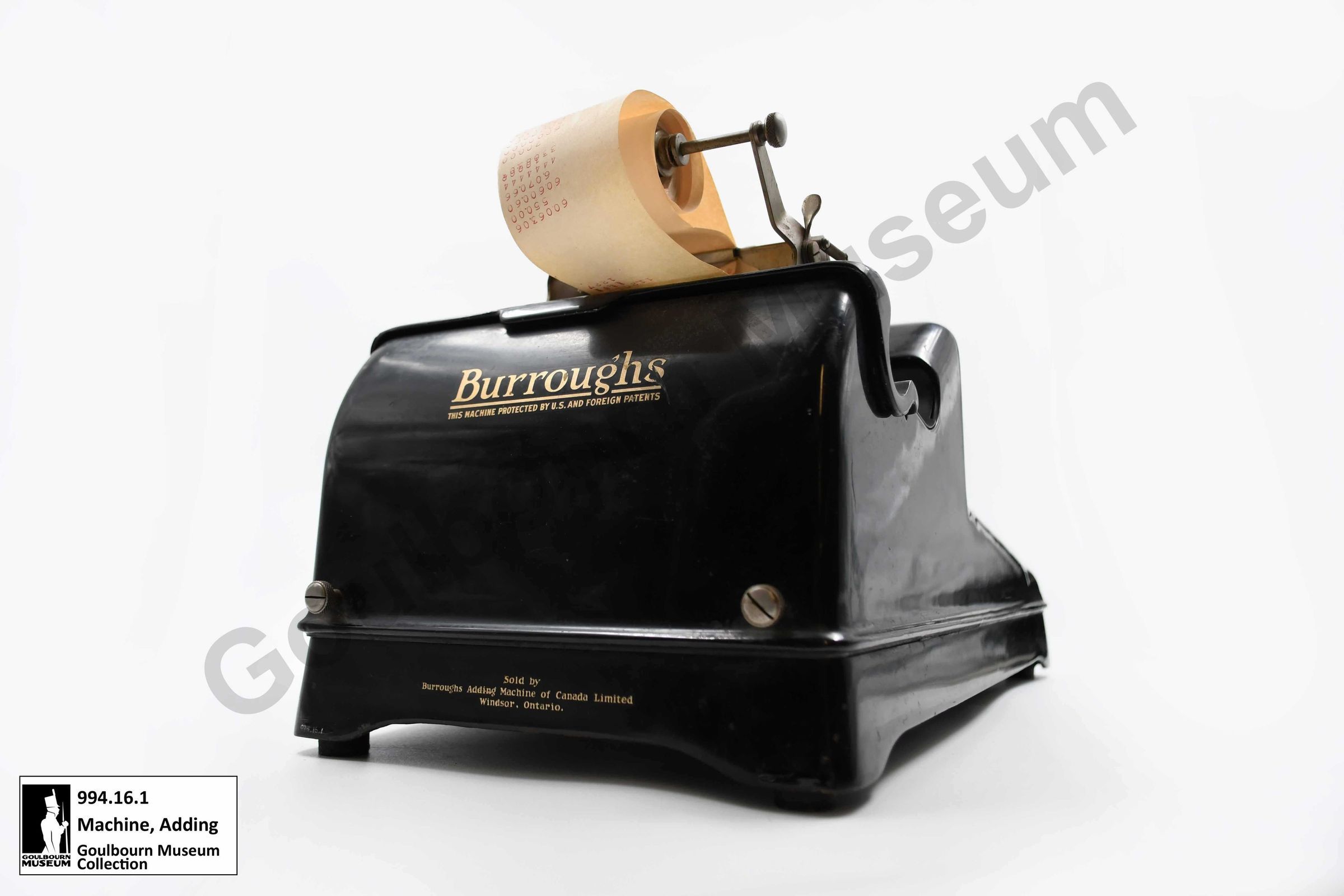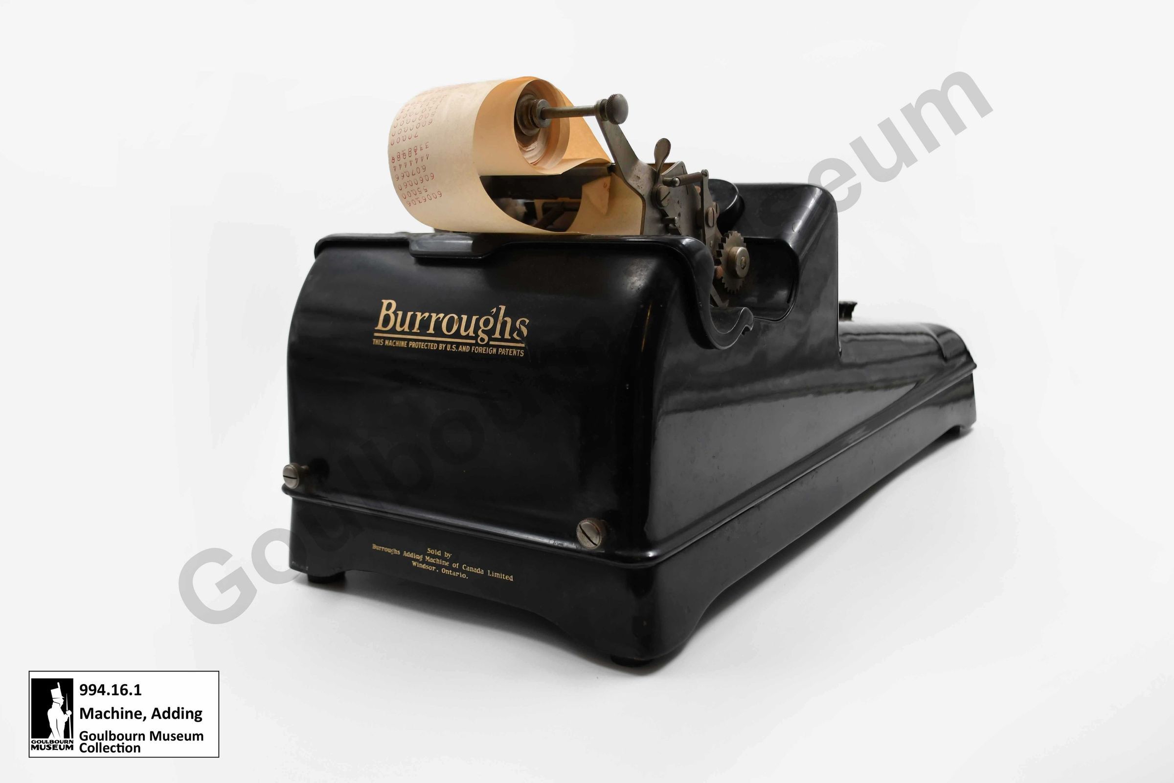 Behind the keyboard is the black ribbon, printing mechanism, narrow carriage, and paper tape. The tape is visible to the operator, unlike that on earlier Burroughs machines. The machine is marked on the back of the keyboard, with a line drawn under the word "BURROUGHS". There is a serial number tag located on the front of the machine, "C3-786726". The back of the machine is marked, "Burroughs" "This machine protected by U.S. and foreign patents" "Sold by Burroughs Adding Machine of Canada Limited Windsor, Ontario."Context