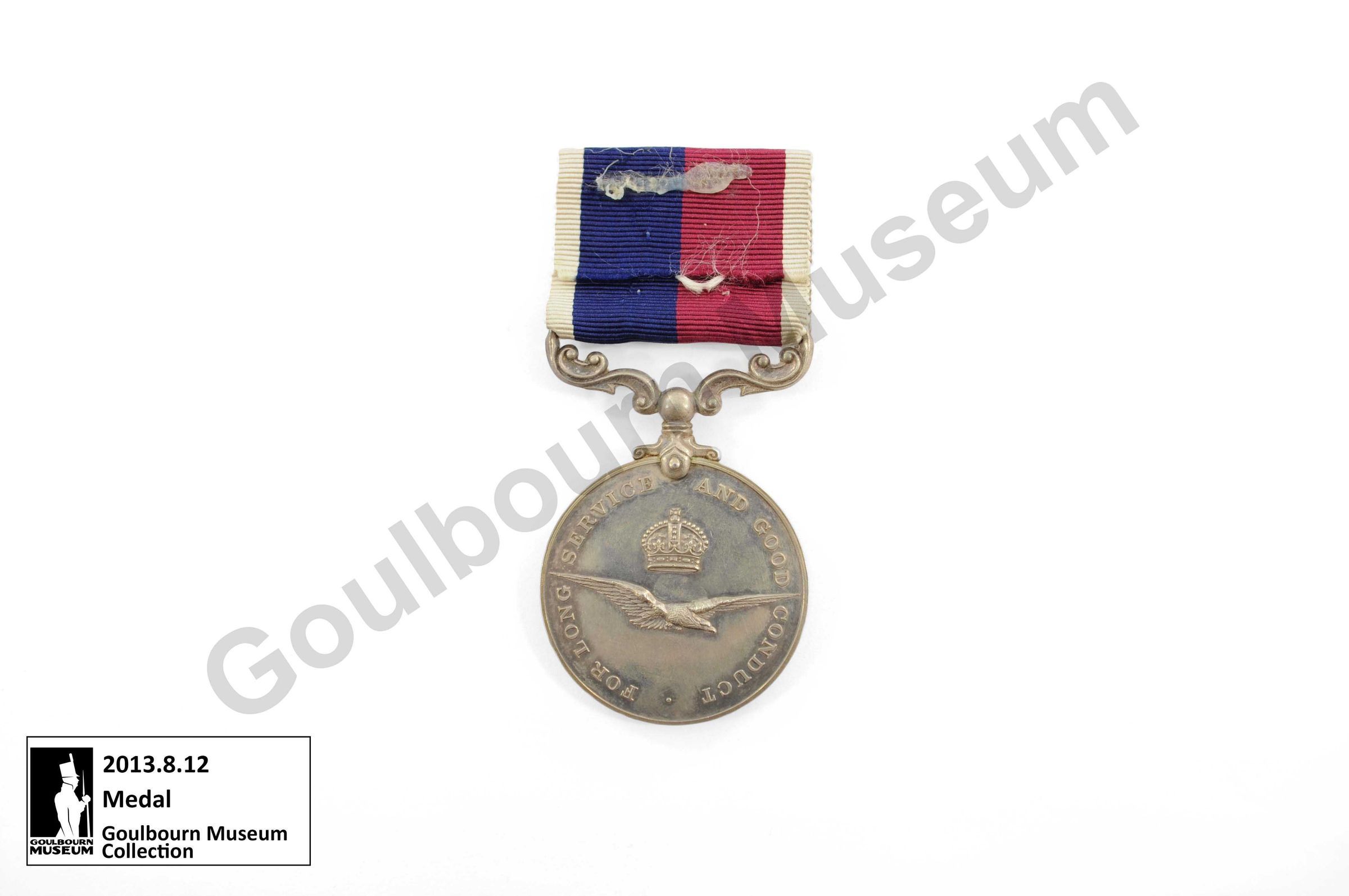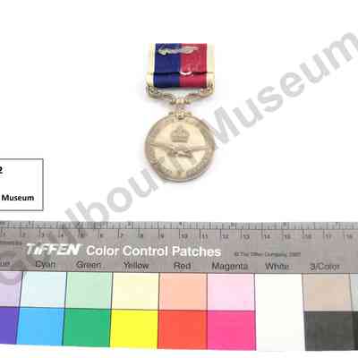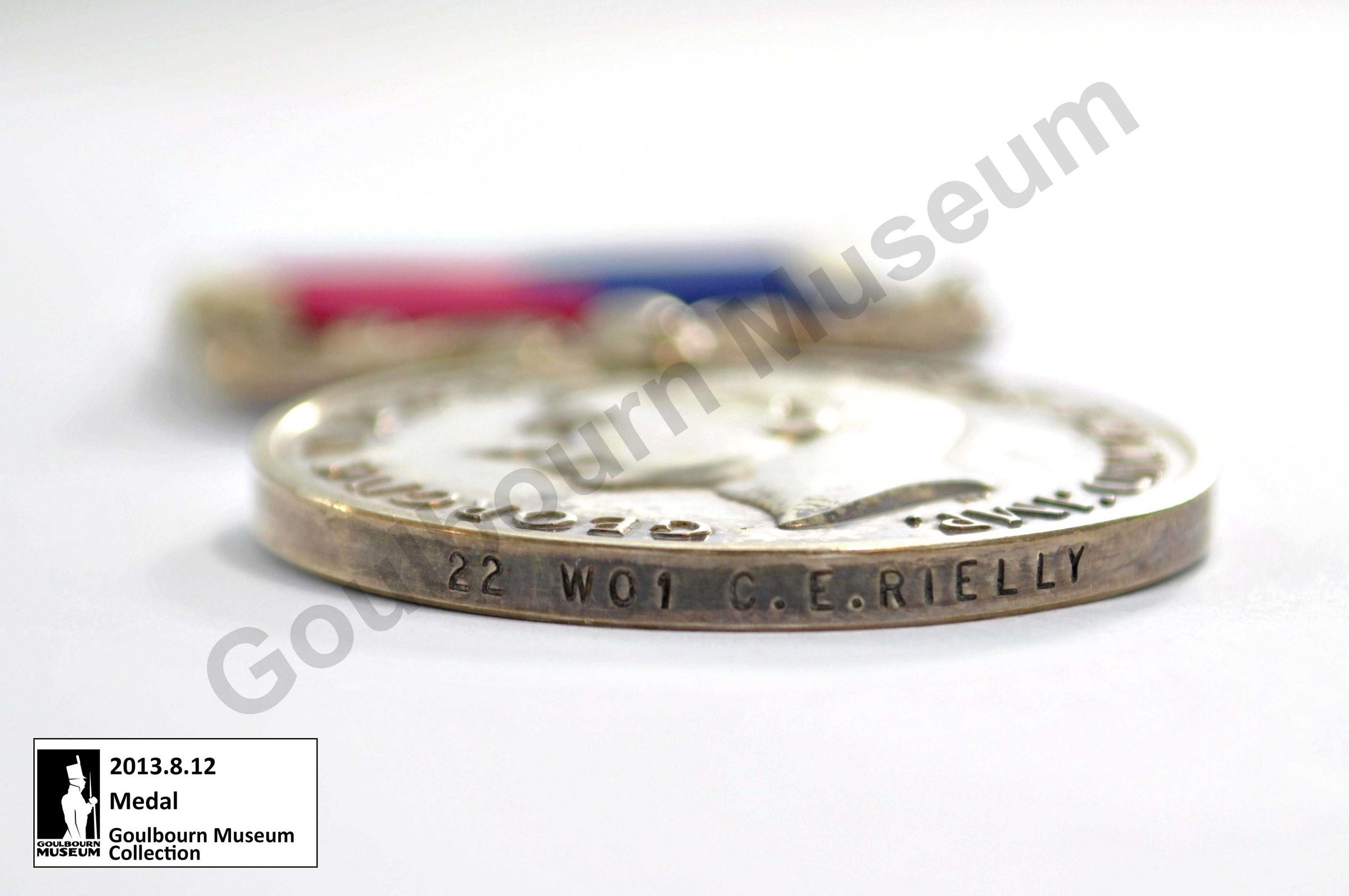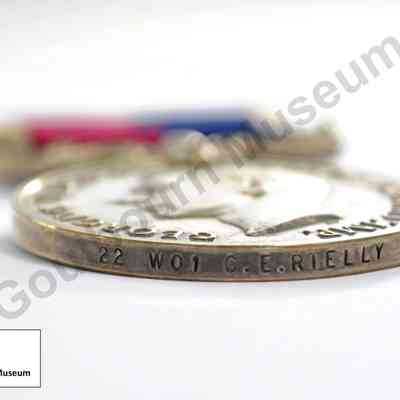 Circular silver medal awarded to Clarence Evelyn Rielly. Obverse of the medal depicts a portrait of King George VI, rendered in profile, with text that reads: "GEORGIVS VI S: G: BR: OMN: REX: F: D: IND: IMP." The reverse of the medal depicts an eagle in flight; a crown appears above, and embossed text appears around the circumference. The text reads: "FOR LONG SERVICE AND GOOD CONDUCT." Rielly, who served as a Warrant Officer; has his name and rank etched into the rim of the medal: "22 WO1 C.E. Rielly." A ribbon is attached to the medal by a metal bar; the ribbon contains four bands of colour: white, burgundy, navy, white.Context