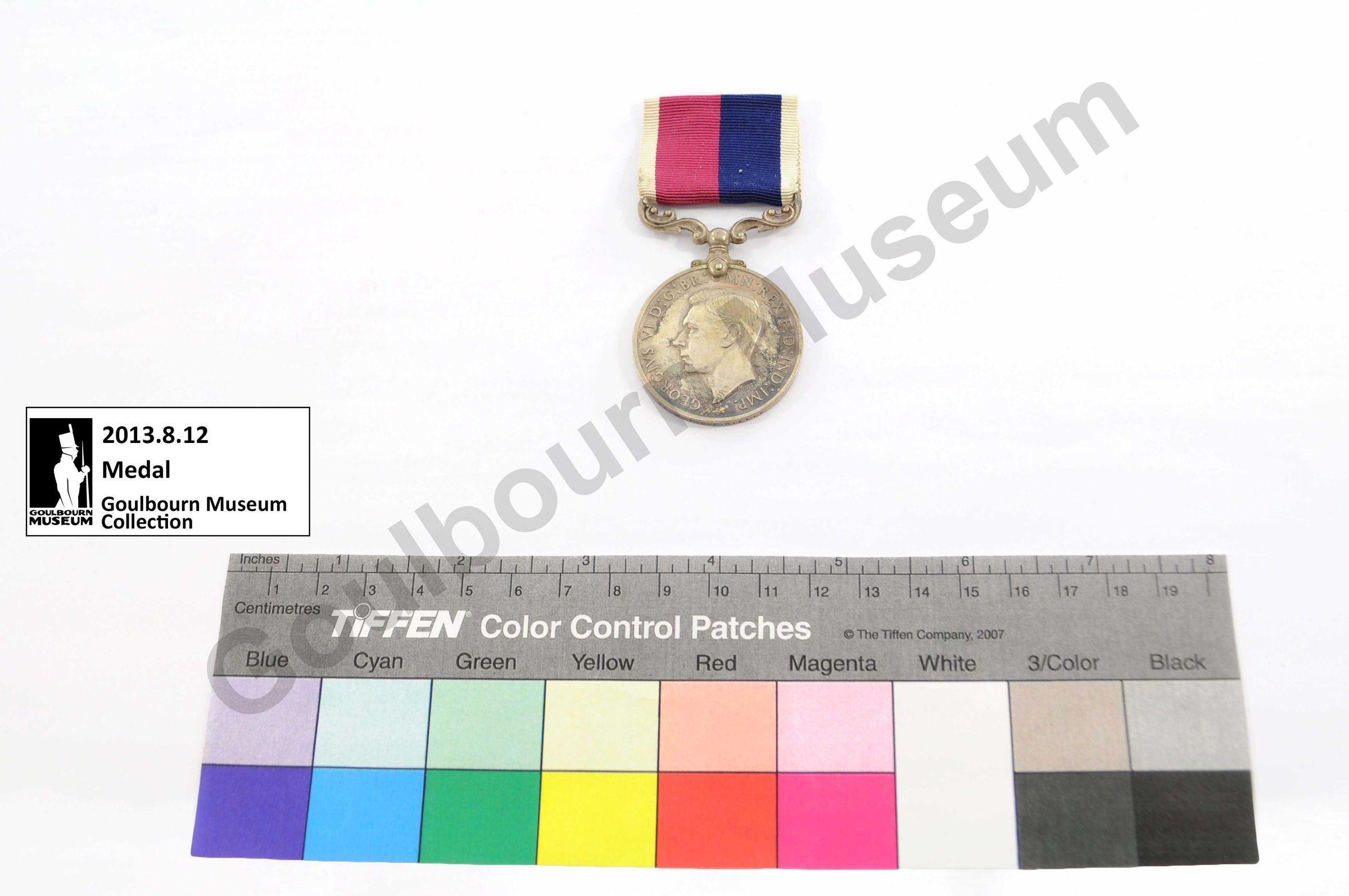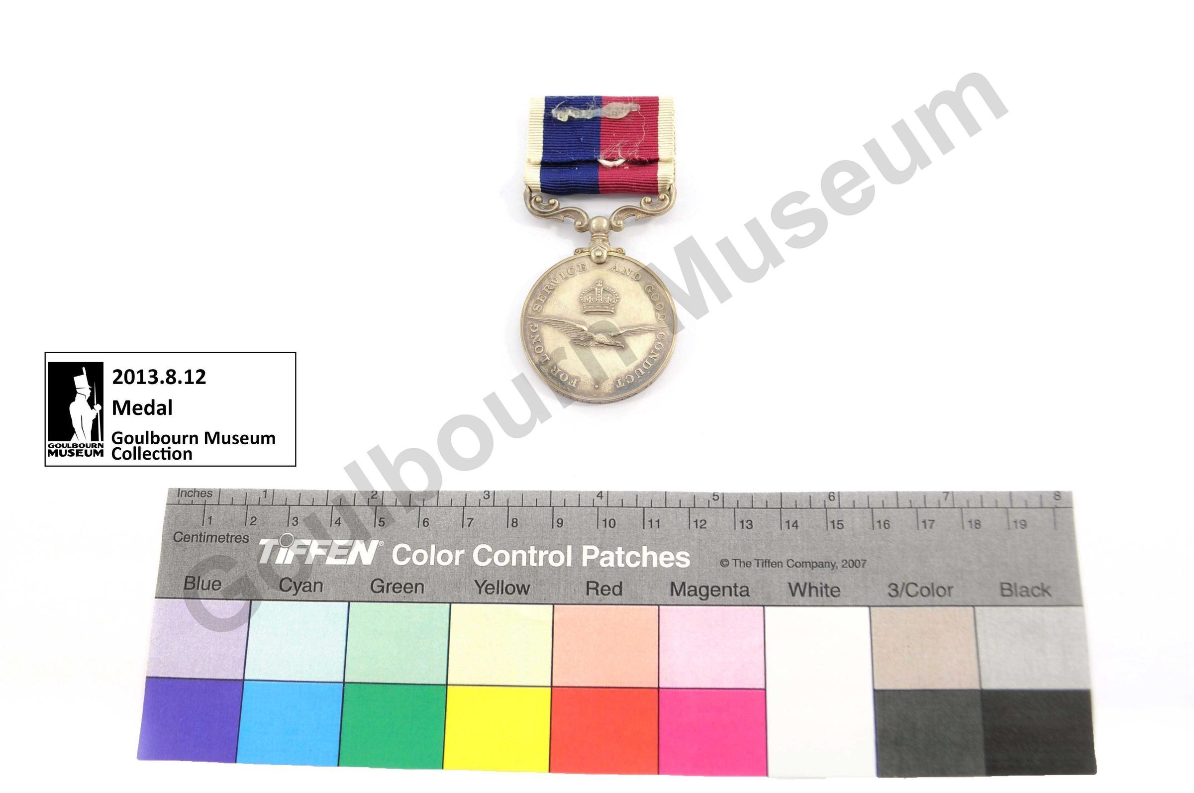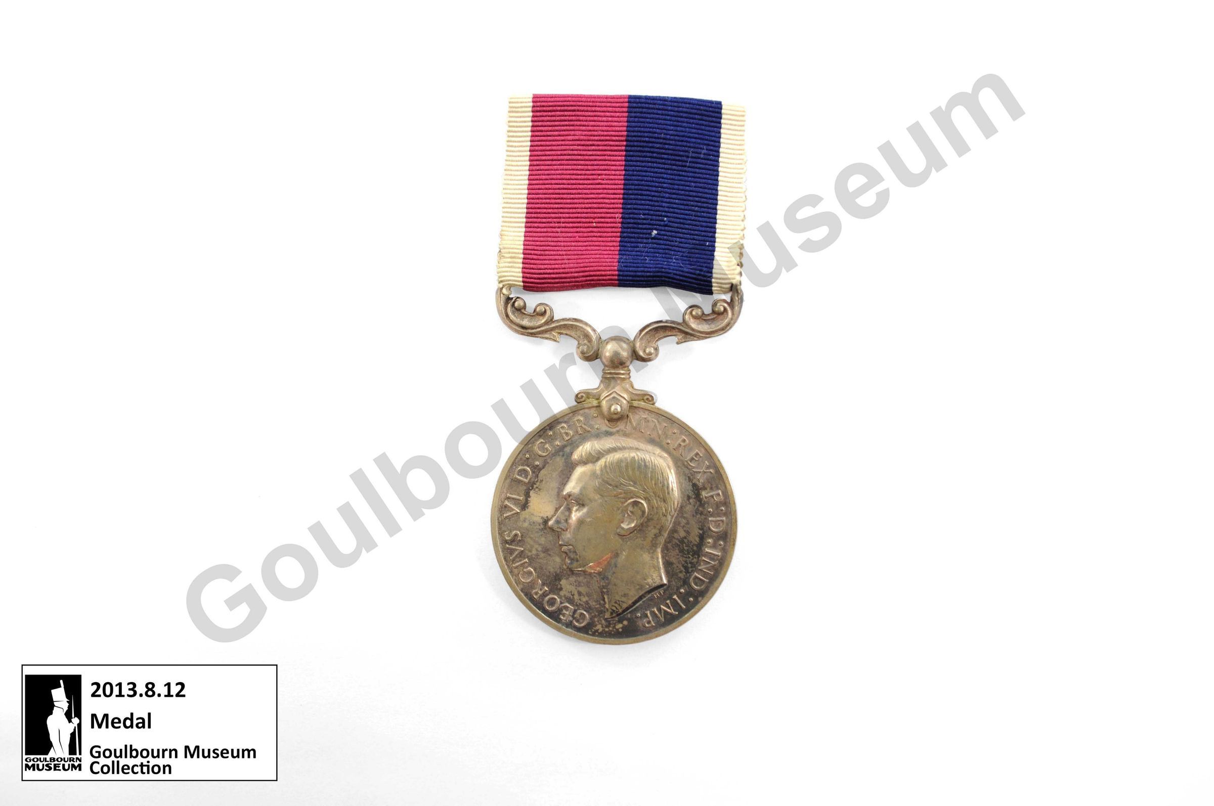 Circular silver medal awarded to Clarence Evelyn Rielly. Obverse of the medal depicts a portrait of King George VI, rendered in profile, with text that reads: "GEORGIVS VI S: G: BR: OMN: REX: F: D: IND: IMP." The reverse of the medal depicts an eagle in flight; a crown appears above, and embossed text appears around the circumference. The text reads: "FOR LONG SERVICE AND GOOD CONDUCT." Rielly, who served as a Warrant Officer; has his name and rank etched into the rim of the medal: "22 WO1 C.E. Rielly." A ribbon is attached to the medal by a metal bar; the ribbon contains four bands of colour: white, burgundy, navy, white.Context