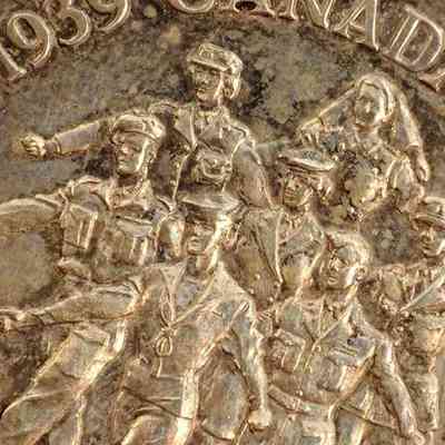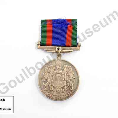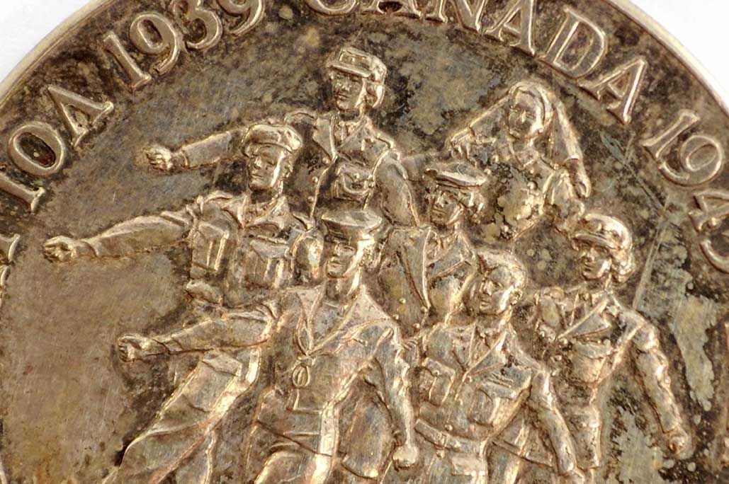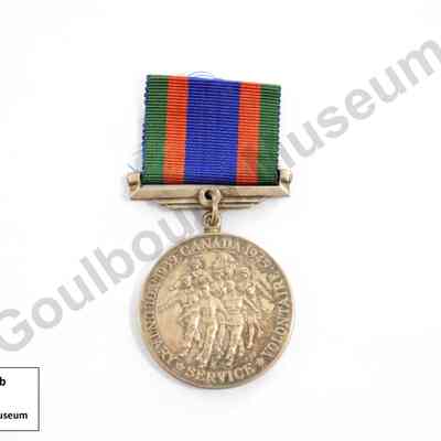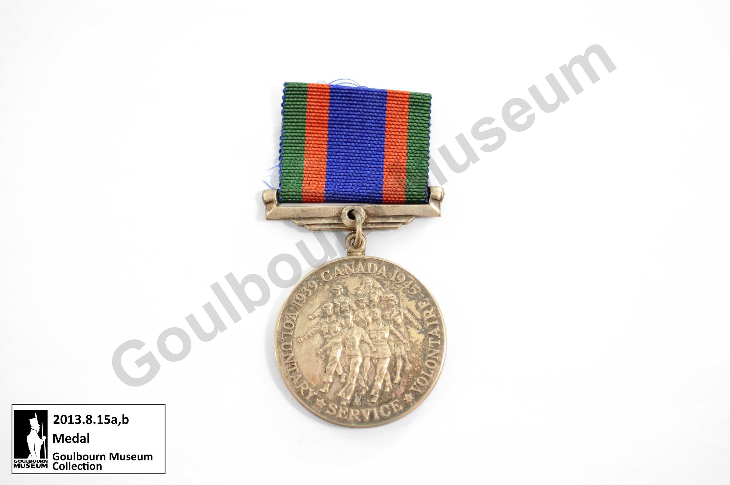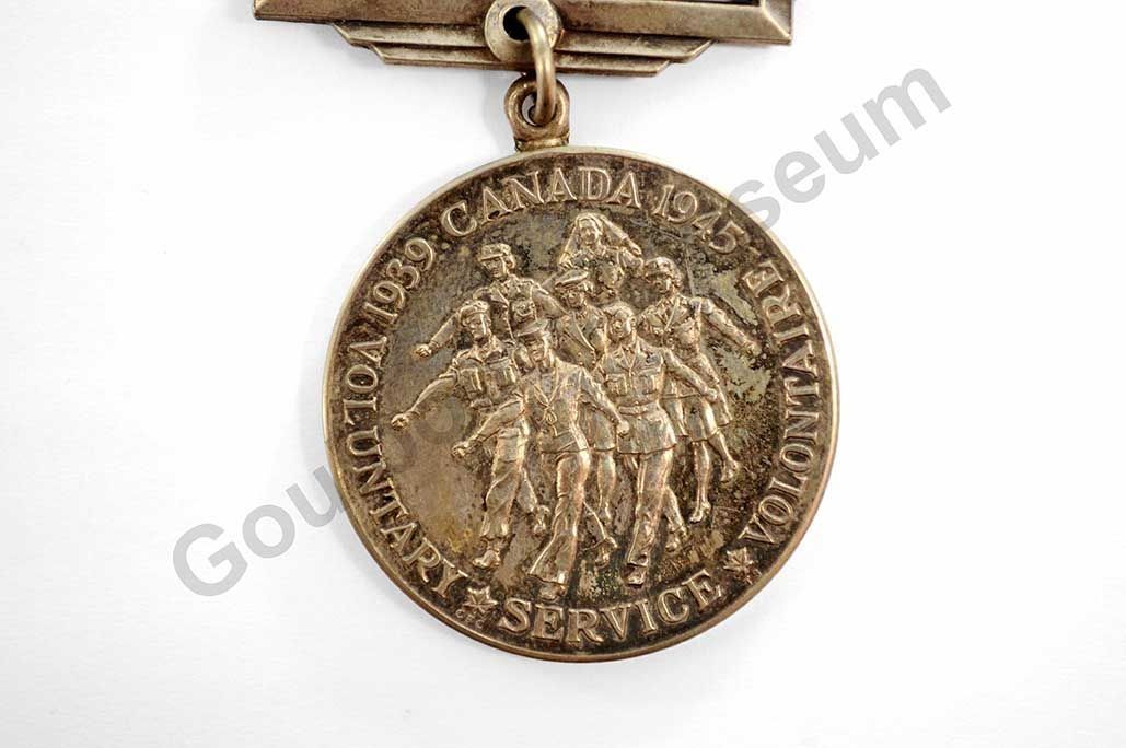 Circular silver medal. The Canadian Volunteer Service Medal was awarded to individuals who voluntarily served in the military, navy, or air force, and completed eighteen months of voluntary service between 1939 and 1947. The obverse depicts seven marching figures dressed in uniform; these figures represent members of the army, navy, air force, and nursing service. The text that appears along the circumference of the medal reads: "1939 CANADA 1945 VOLUNTARY SERVICE VOLONTAIRE." The Canadian Coat of Arms appears on the reverse. The medal is attached to a ribbon by a metal bar; the ribbon contains five bands of colour: green, red, blue, red, green.Made/Created