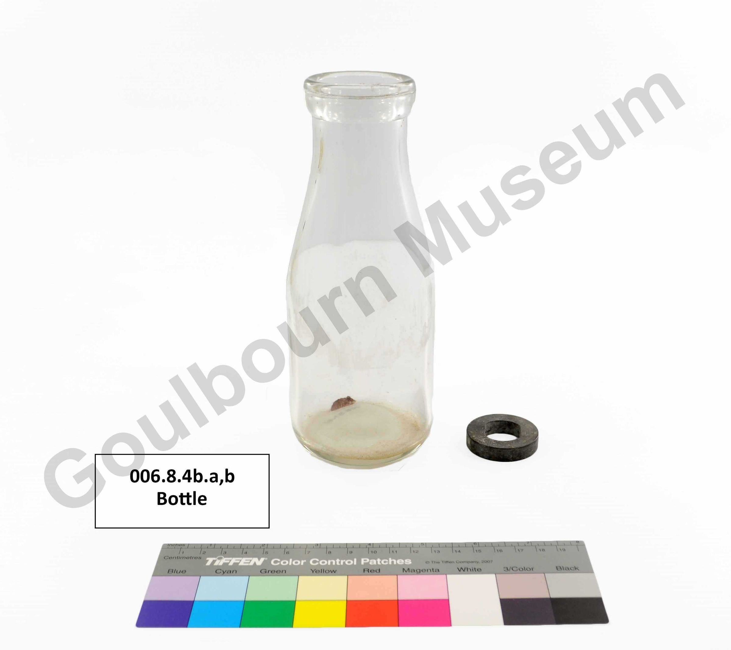 One clear glass round milk bottle, wider at the bottom and narrows at the spout. Also has a metal ring that goes with it.Context