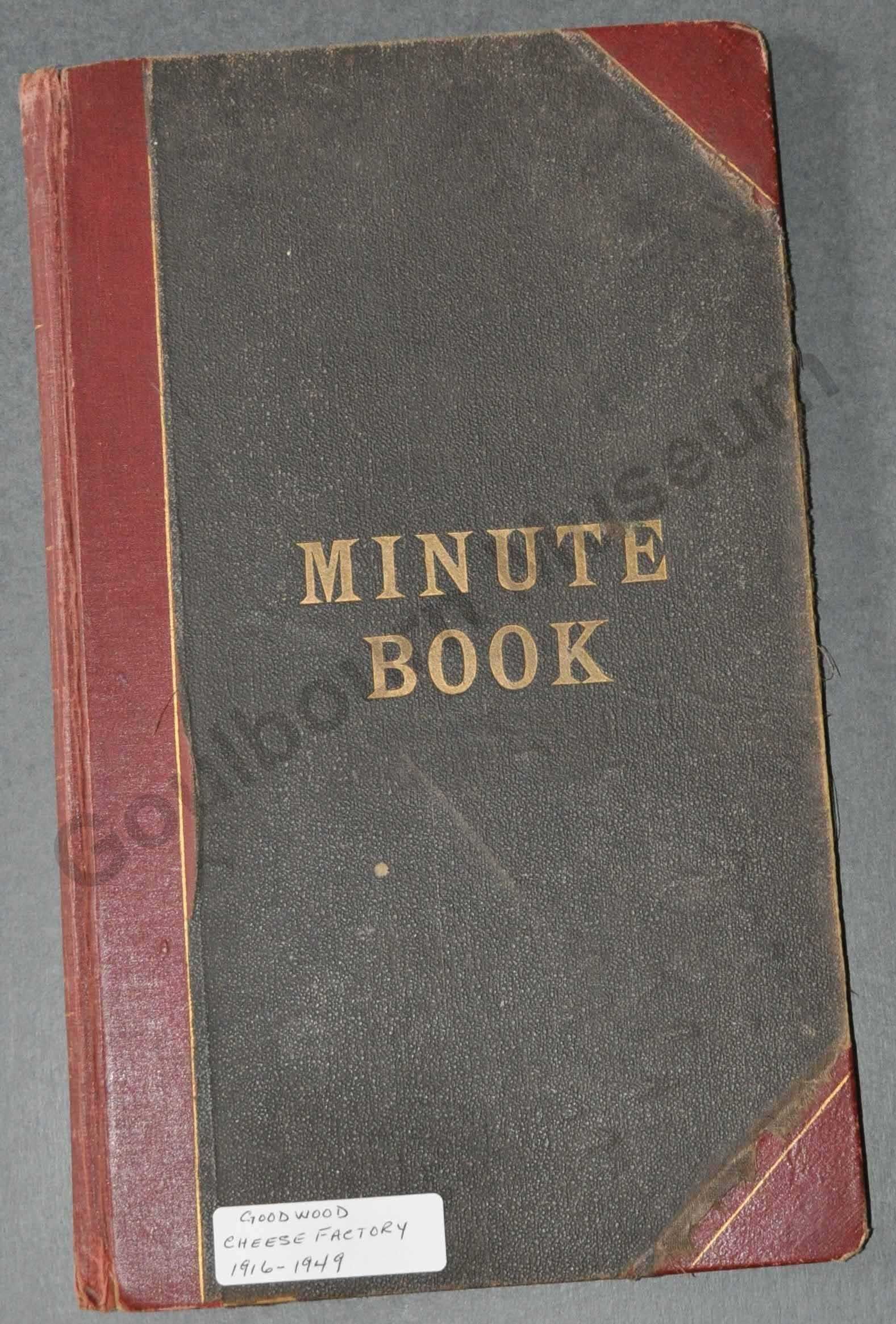 Black cover with red corners and spine decorated with dark red coloring, text in gold reading "Minutes Book".