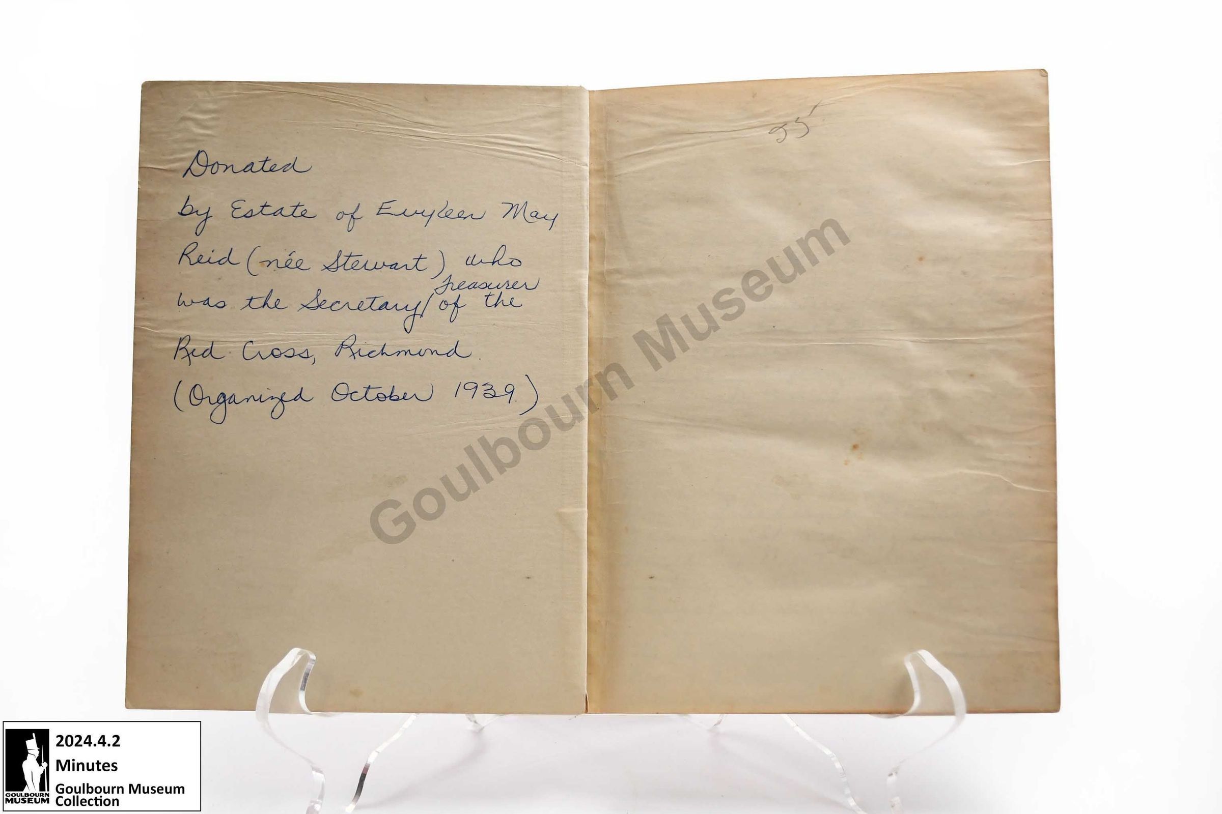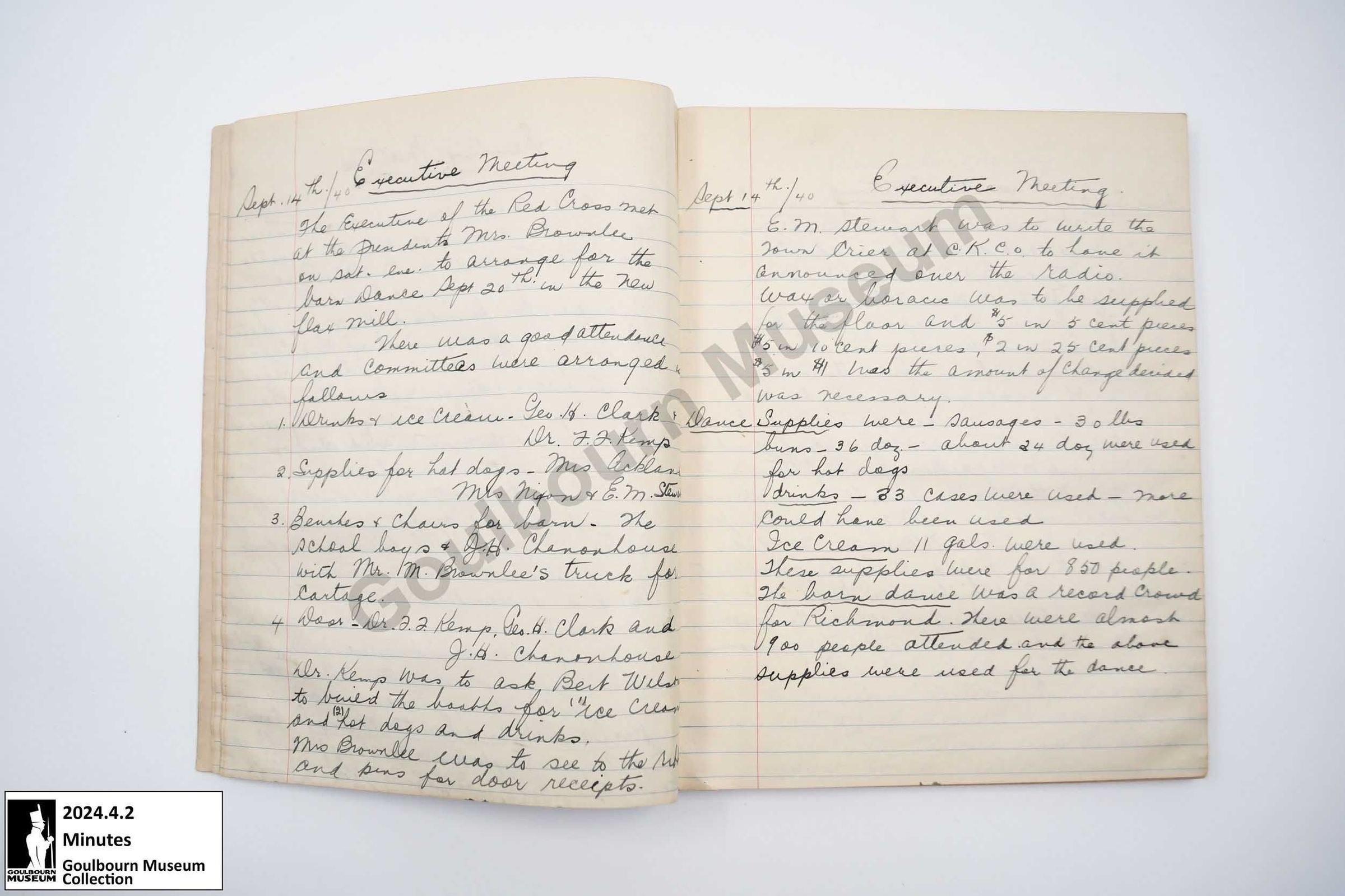 Richmond Red Cross minutes, membership list, and treasurer records. Notebook is comprised of a red patterned cardboard front and back cover with blue fabric material as the spine. There is a notation on the inside front cover which reads, "Donated by Estate of Evyleen May Reid (nee Stewart) who was the Secretary / Treasurer of the Red Cross, Richmond (Organized October 1939)" The book contained lined pages with handwritten text. The book begins with an account of the "Organization of Red Cross 1939." Following entries are minutes from executive meetings of the Red Cross, public meetings of the Red Cross, Red Cross Euchre, sewing meetings, and annual meeting. The back of the notebook includes Red Cross membership lists and donations for 1940-1941, financial accounting of the organization, and membership and donations for 1939-1940.Context