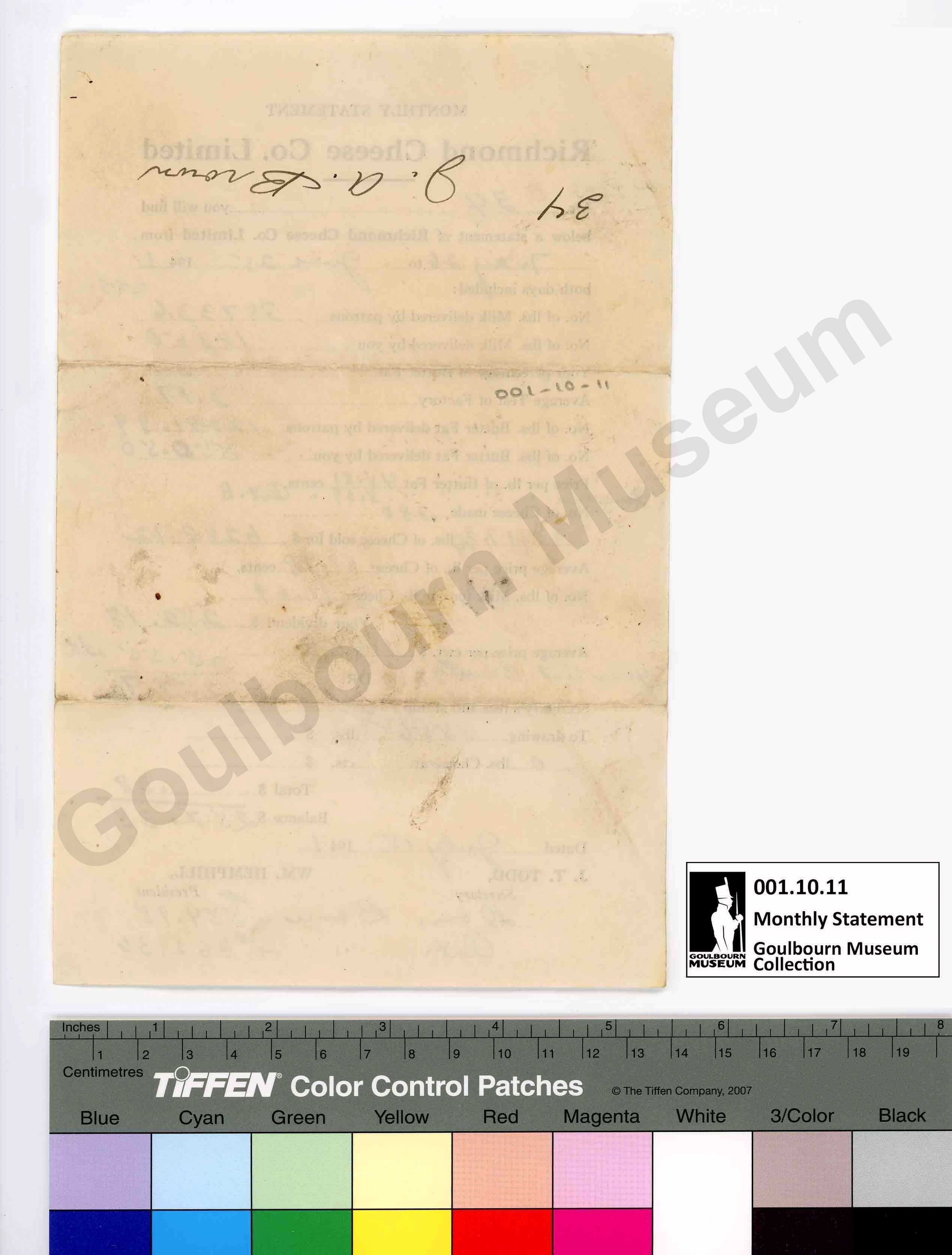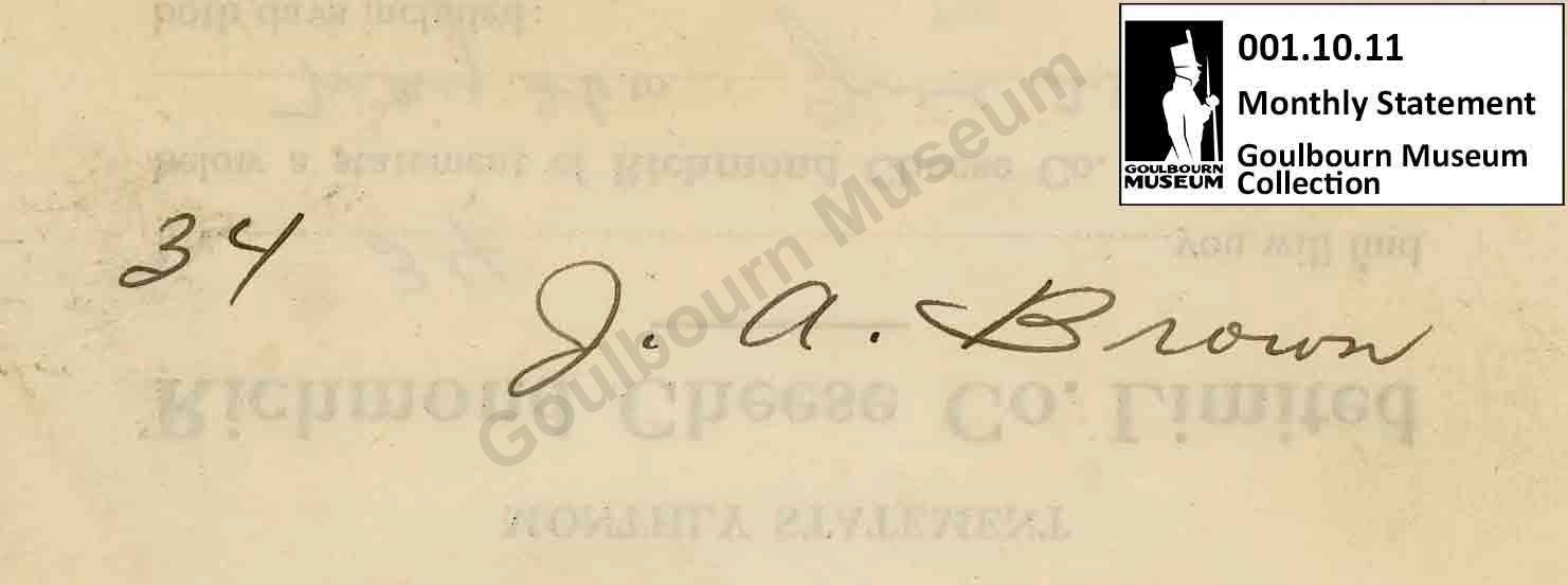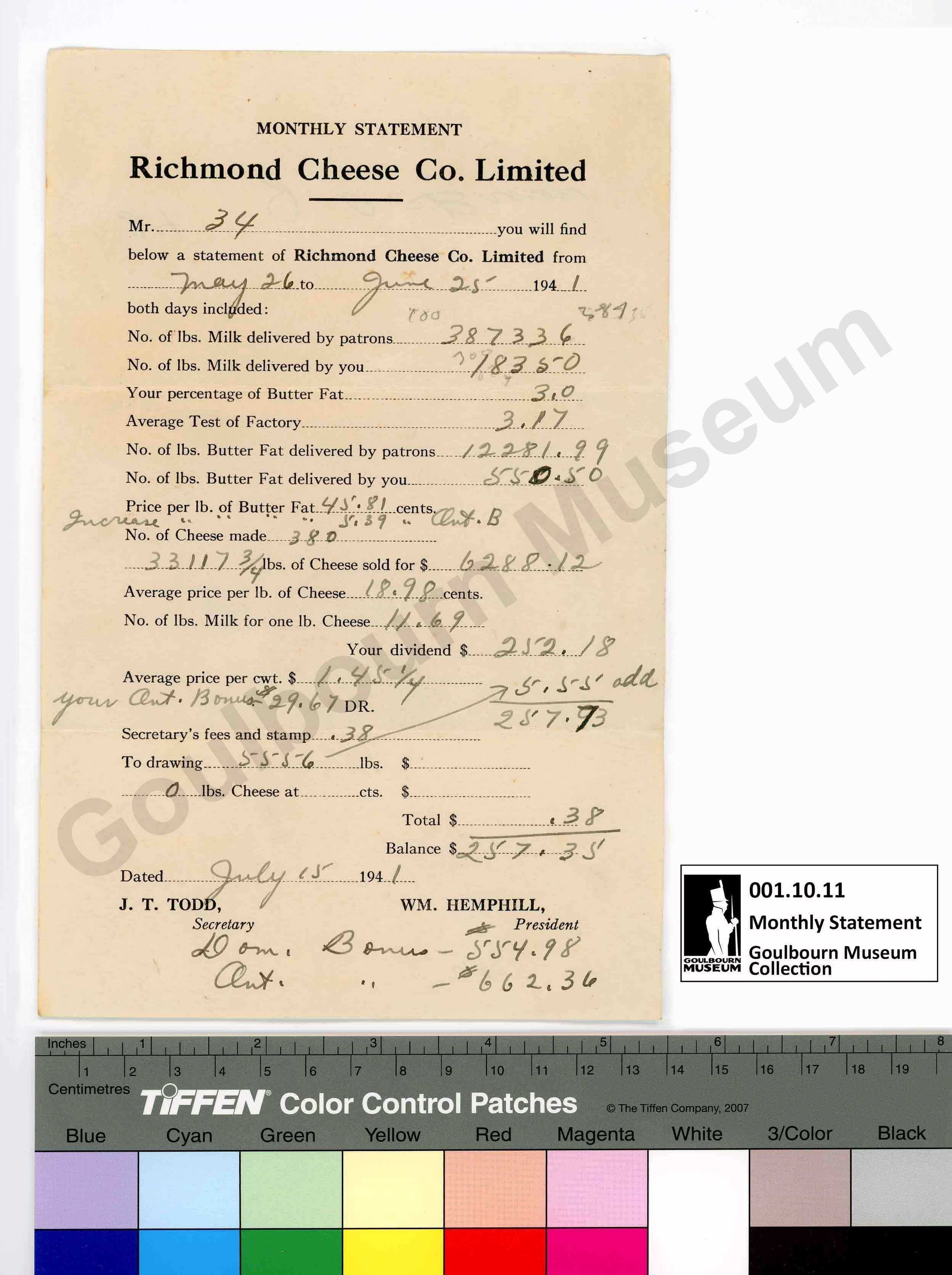 This object is a monthly financial statement issued by Richmond Cheese Co. Ltd. The support is a cream colored paper. The medium is a printed black ink. The form has been filled out by hand with a blank ink. The title reads "Monthly Statement Richmond Cheese Co. Ltd.". The record is for the dates May 26-June 25 1941. The name "J.T. TODD" appears at the bottom proper right with the title 'secretary'. The name WM. HEMPHILL" appears at the bottom proper left with the title 'president'. There is an inscription on the back, rendered upside-down in relation to the documents primary text. It is located at the top center. The inscription is rendered in a handwritten black ink. The inscription reads "34 J. A. Brown".Context